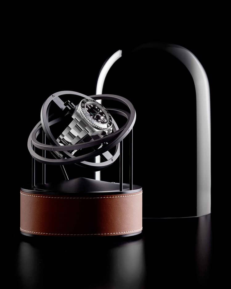 It’s a perfect companion to keep your premium timepiece primed and ready whenever you need it. The base uses top-grade leather that comes in several colors such as green, black, tan, silver, and orange. Your watch will be positioned right in the middle of a double-axis movement set of rings that becomes a gyroscopic work of art in motion. The rings are fashioned out of stainless steel and can be coated in glossy chrome, gold, or black. The set also includes a beautiful glass bell cover to keep dust away as well as a leather travel case.