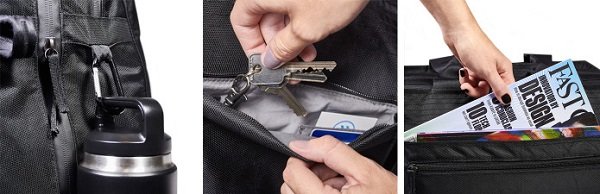 Moreover, this carry-on bag has a ton of external features to help organize things while on the go. It features an ingenious TSA pocket to hold valuables during airport security check. It has a couple of front quick access zipper pockets and a quick access magazine sleeve with magnetic closure. There is also a key clip and storage for your cards.