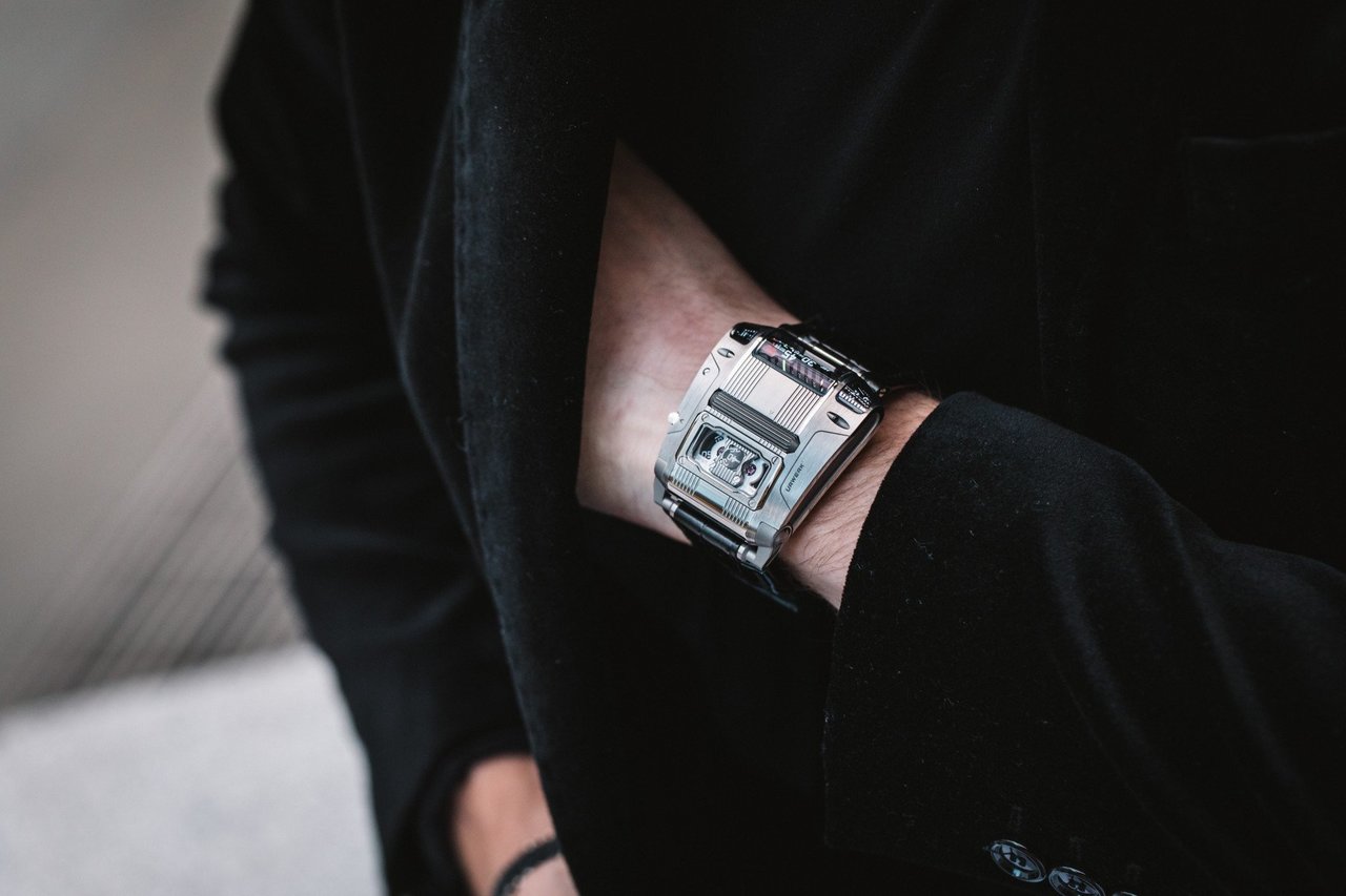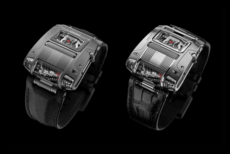 The lower set of mechanisms of the $135.000 Urwerk UR-111C show the jumping hours on the leftmost cone, the running minutes on the rightmost cone, and finally a retrograde indicator in between to show the minutes via a helical cylinder. You can go for a brushed steel or matte gunmetal finish. Both variations are very rare with only 25 pieces for each variant.