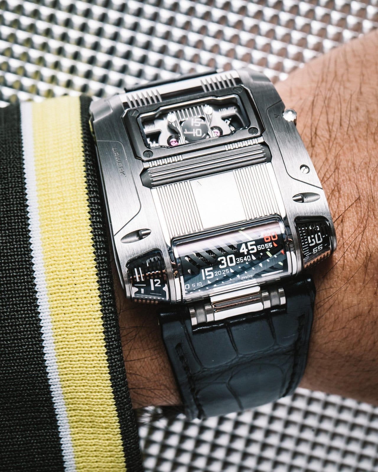 Instead of a circular dial used by conventional watch designs, the UR-111C depends on several complications to count the hours, minutes, and seconds. Adjustments are made via a special lever that swings out and a textured cylindrical roller that sits just below the running seconds’ window. You can turn the roller in either direction to set the timepiece appropriately.