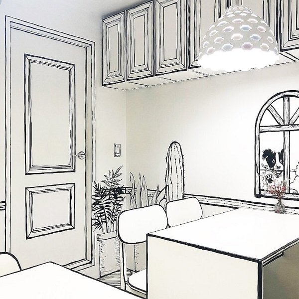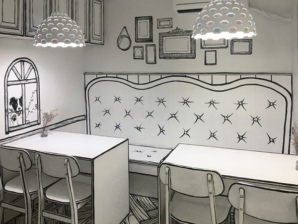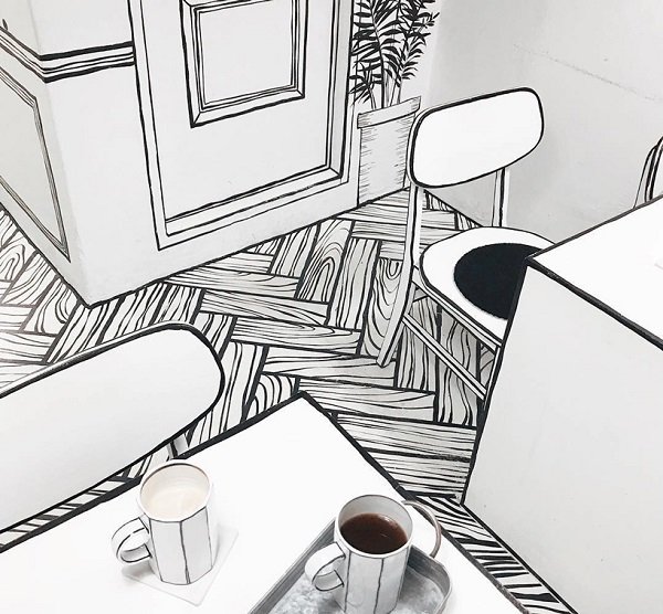 Instead, this trendy cafe features all-white walls while dark black lines adorn the walls, the ceiling, and even the tiles on the floor. Likewise, black lines contour the chairs, tables, mugs, and plates to create the flattened look of a drawing.