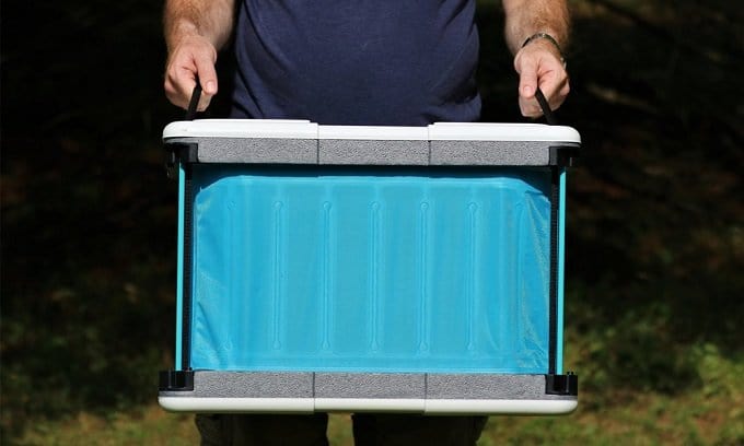 This ingenious device only needs water and utilizes an evaporative cooling system to keep its contents cold. It uses a material called PhaseTek, which allows water vapor to easily evaporate from the sides of the box without letting any of the liquid to leak out. The material holds water within the actual walls of the cooler.