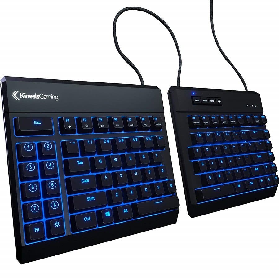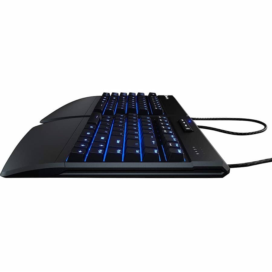 Response time is critical when you want to stay on top of the competition, which is why pros avoid wireless models. Kinesis equips the Freestyle Edge with gaming-grade components and an option to select the type of Cherry MX switches. The blue backlight matches perfectly with the matte black finish of the keyboard. To make it even more ergonomic, the brand offers an optional accessory to lift the device at an angle to keep your palms in their natural relaxed position.