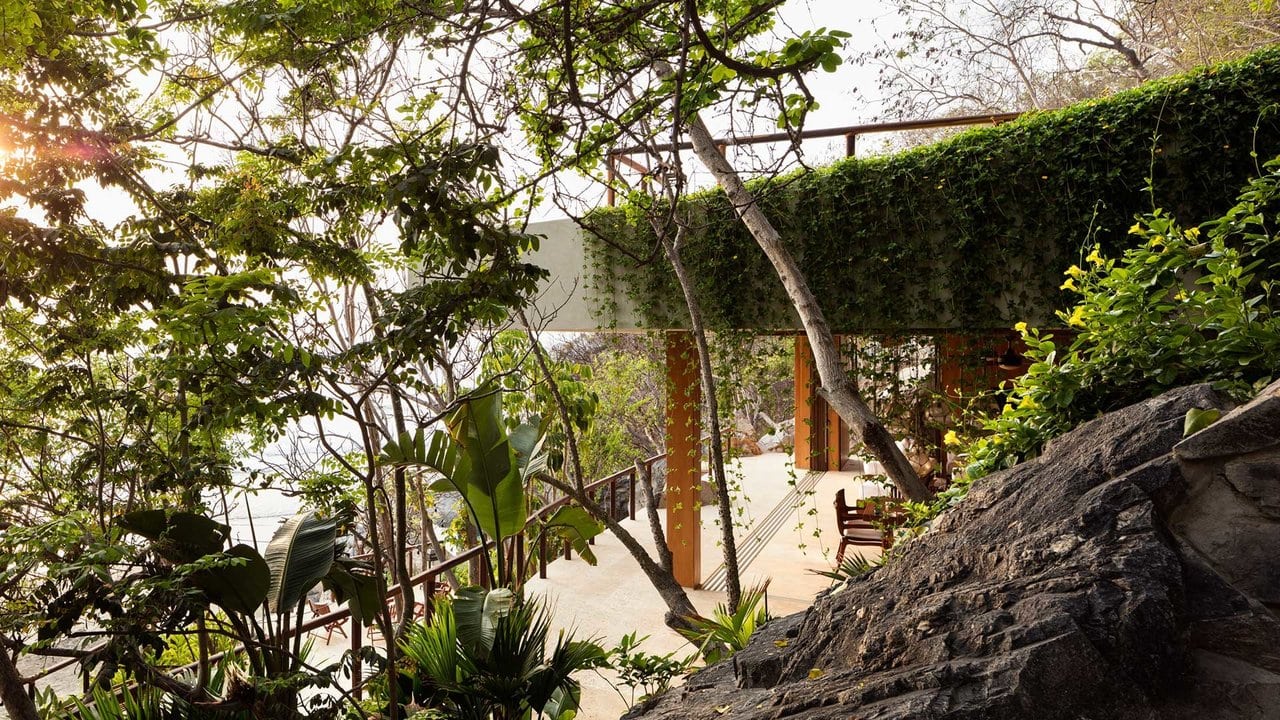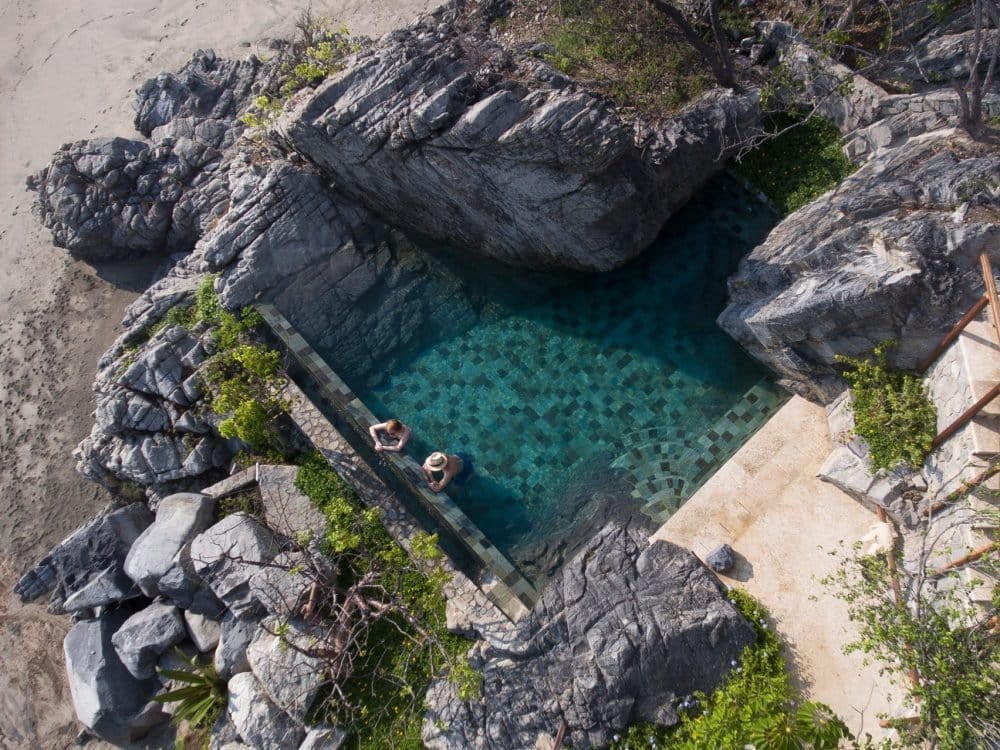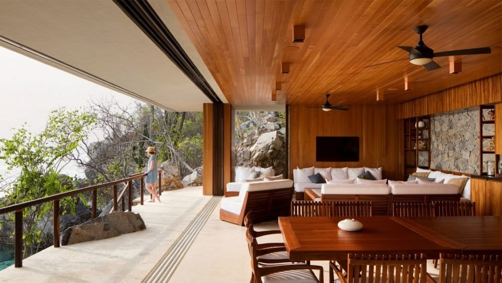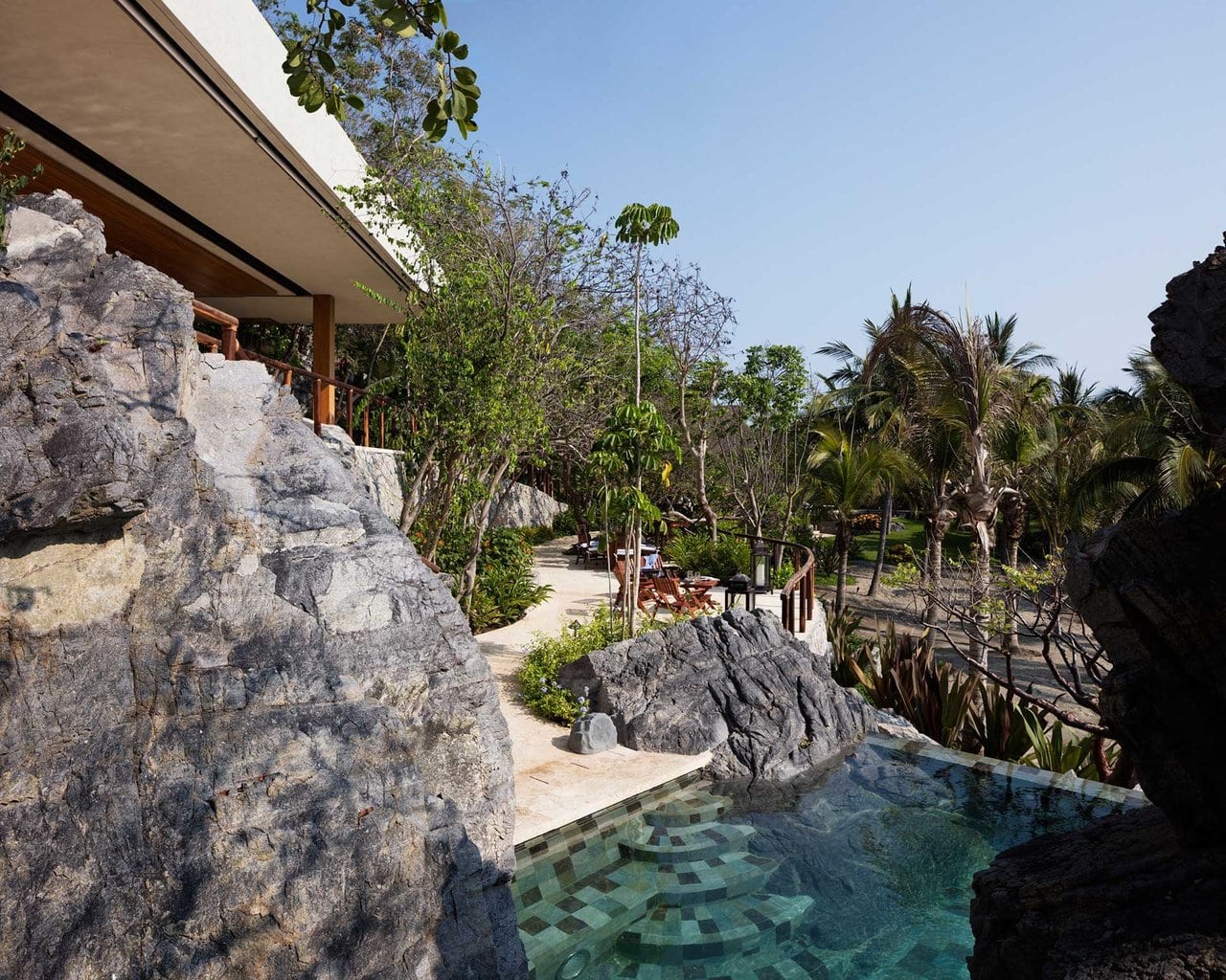 The cabana boasts a unique, unconnected roofing structure. It integrates a palapa redesigned into a cover, extruding from the mountain out toward the ocean. The swimming pool is another highlight, featuring large boulders that make it seems like a miniature pond.