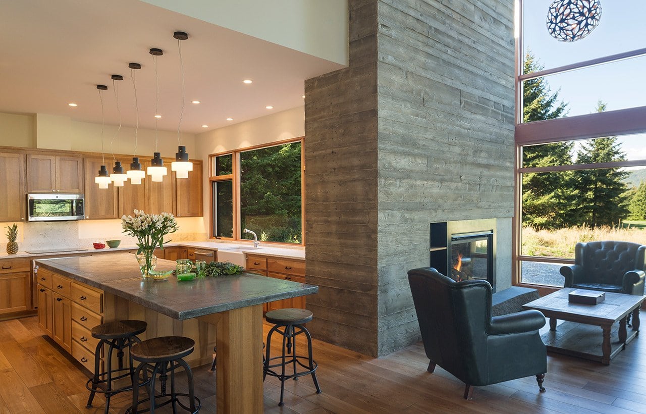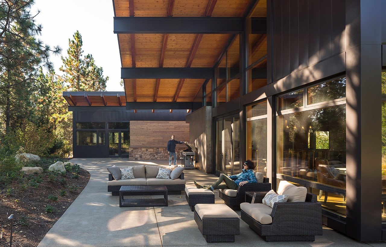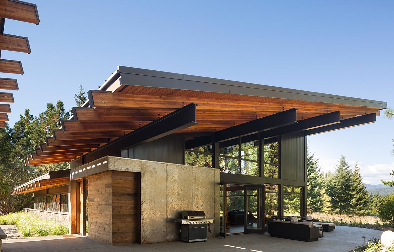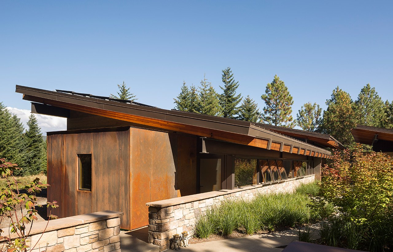 Other notable sustainability features of the Tumble Creek Cabin include its radiant floor heating; an Energy Recovery Ventilation System; energy efficient aluminum-clad wood windows and doors; and use of rustic materials, including stone, weathering steel, and reclaimed barn wood with modern detailing. Oh, and did we mention the house has its own electric car charging station?