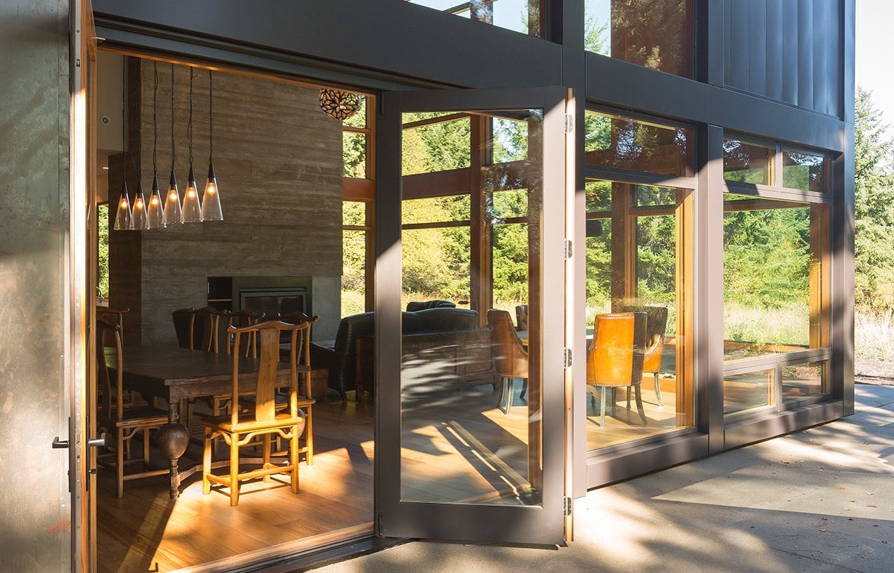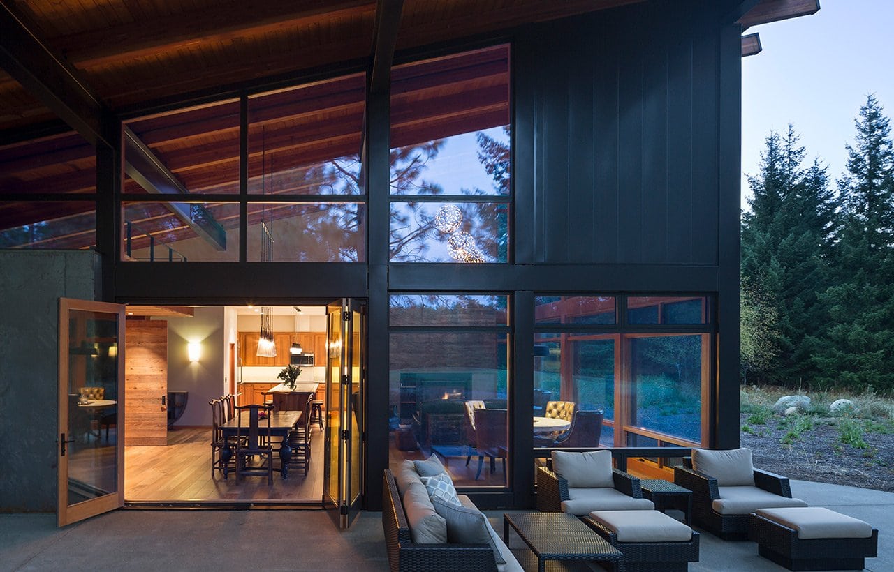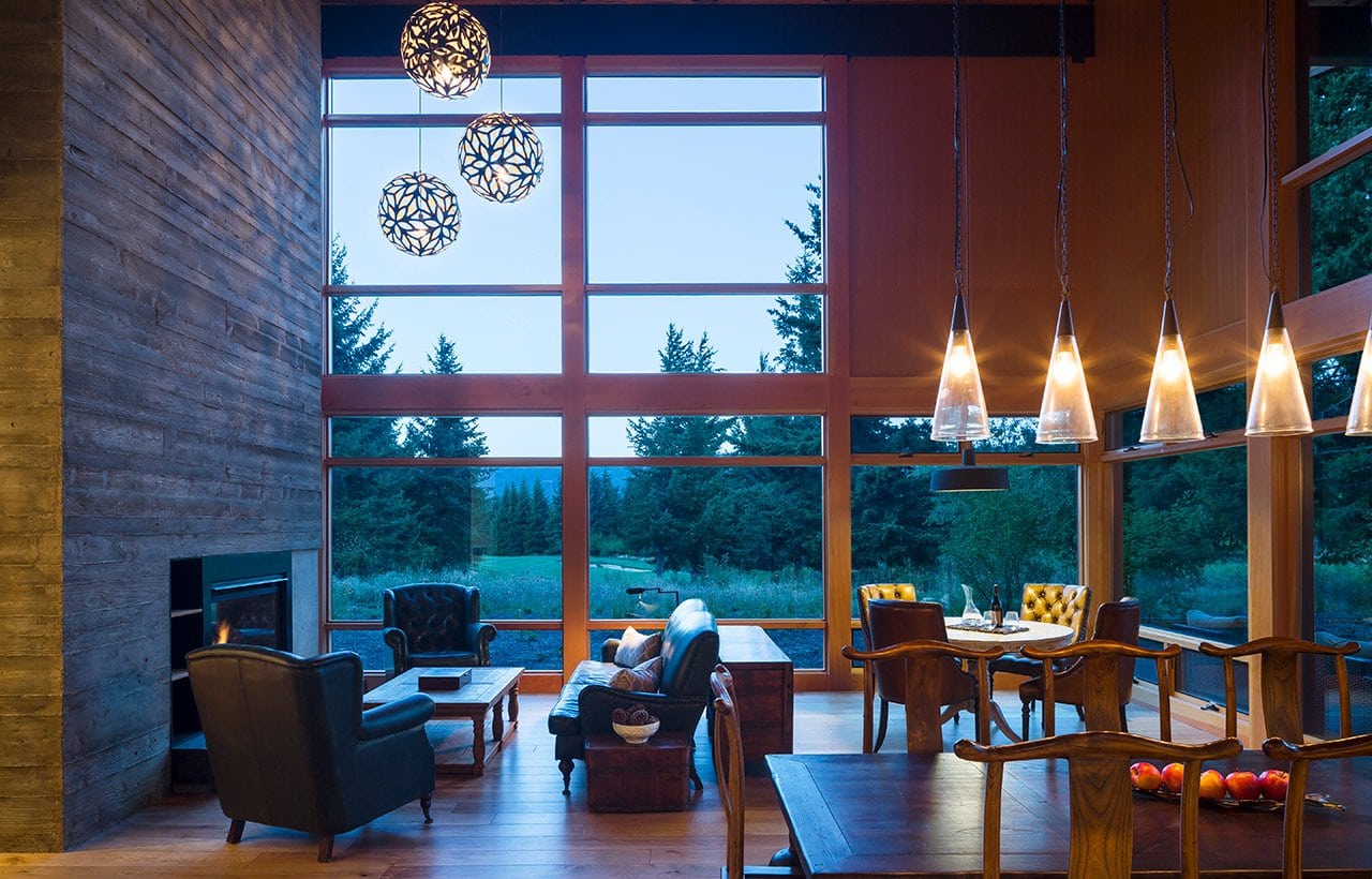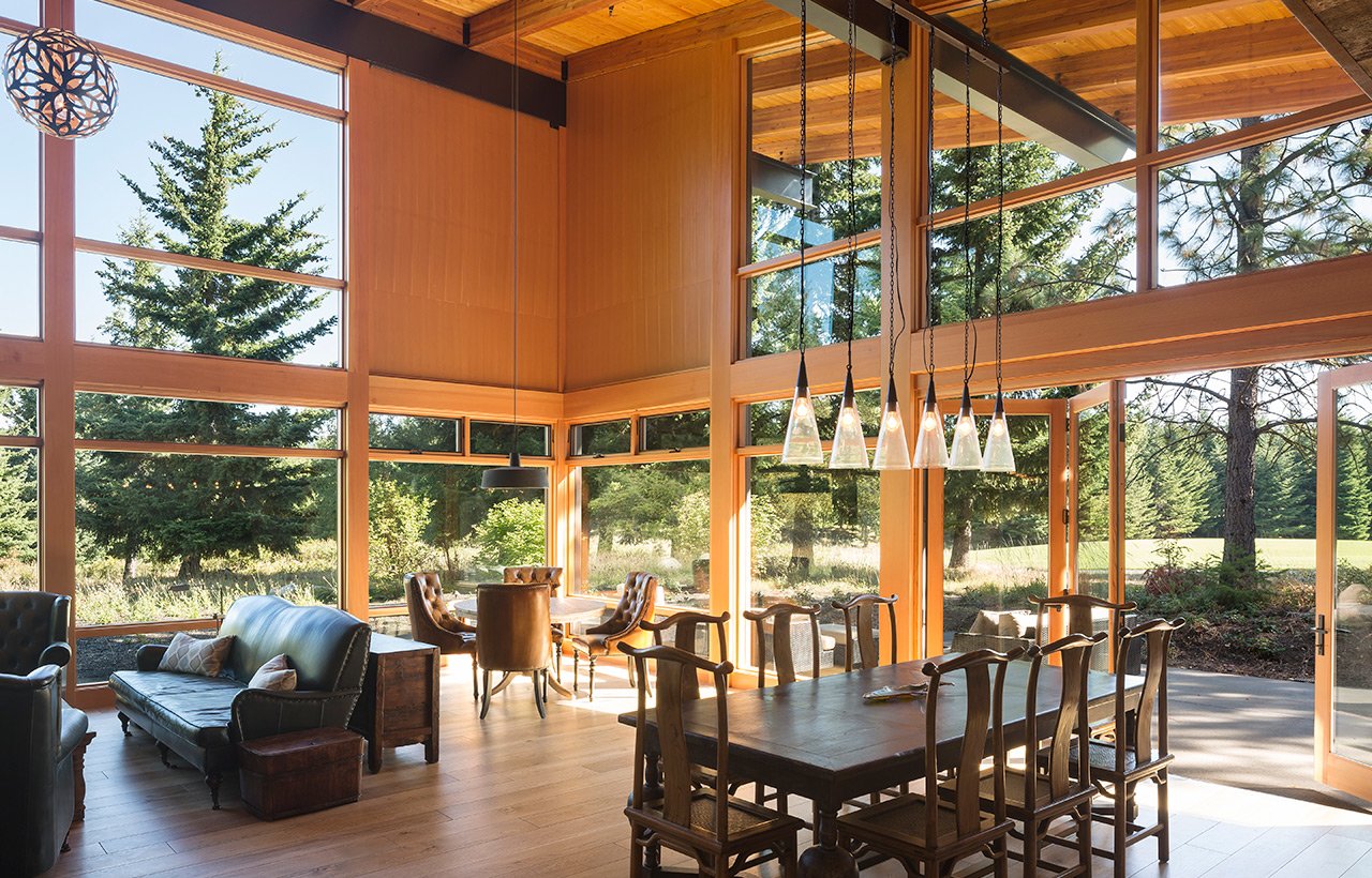 The main living room and the dining area of the Tumble Creek Cabin feature vaulted ceilings with exposed steel and wooden structural elements, allowing the space to feel more open, while the floor-to-ceiling windows offer terrific views of the landscape beyond.