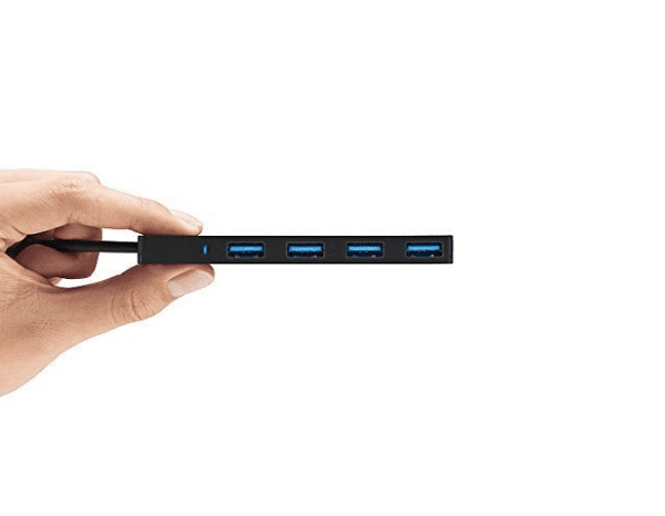The Anker 4-Port USB 3.0 Hub uses a reinforced connector cable and heat-resistant connectors for durability. Likewise, it is designed for portability with its compact size at just 1cm thick and weight at only 1.23 ounces. It can fit in a deep pocket and doesn’t take up much space in your bag.