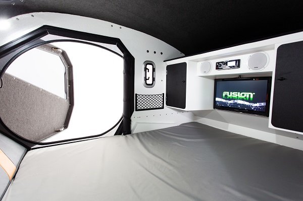 This teardrop camper measures 2.4 meters high and offers hi-tech amenities not found in any of its kind. It has a heated sleeping space with a queen size bed and fully upholstered backrests that provide comfort when you decide to watch a movie from the 21″ HD T.V.