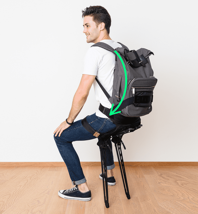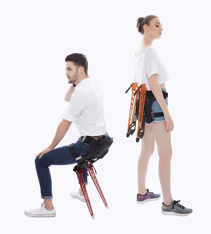 This sitting tool is not your typical four-legged chair. Instead, it is an endoskeleton of aircraft grade aluminum meticulously crafted to create a two-legged seat, which is easy to put on. Just strap it to your waist and thighs and pull down the legs when you need to sit.