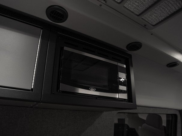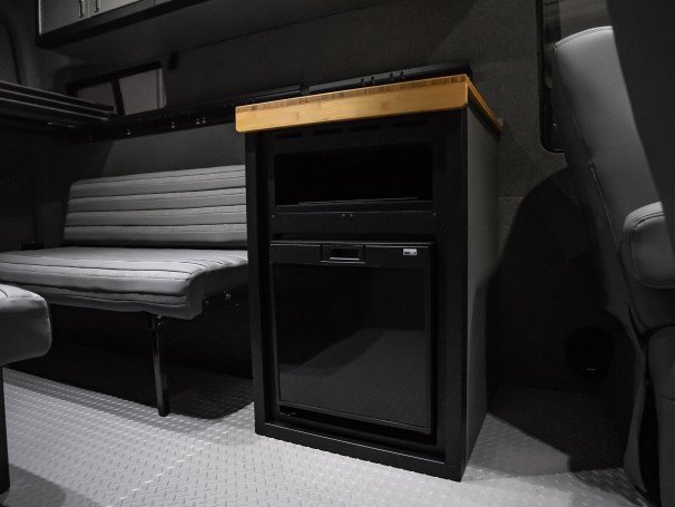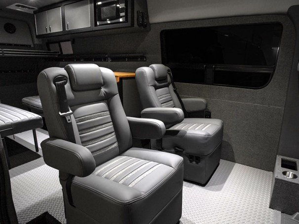 The interior features a carbon fiber trim, suede ceiling, and walls outfitted with ambient lighting. Yes, they’re adjustable. In the front cabin there’s a a mini fridge, a microwave, and a 24-inch LED TV — Apple TV and Wi-Fi included. There are convertible beds and even storage for bicycles, skis, and other outdoor gear. Keeping things cool is a heavy-duty AC system, which offers adjustable overhead air distribution. It’s clear that Lexani made this for off-road adventurers who don’t want to leave behind the comforts of modern civilization entirely.
