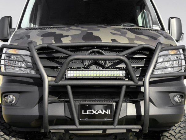 You can customize the trim, seats, cabinetry installations, and many other elements as you see fit. However, the standard form always comes in a sleek camouflage wrap. The camper van features 20-inch forged monoblock wheels — designed by Lexani themselves — with 33-inch off-road tires. A solar panel sits on the roof, while the front and rear bumpers feature new LED light bars.