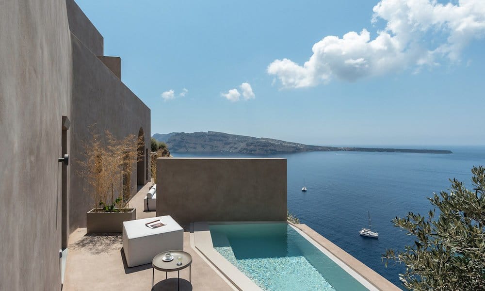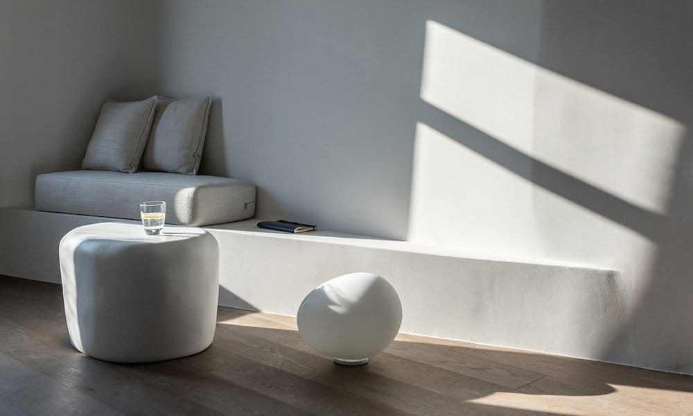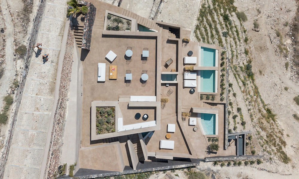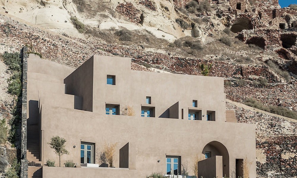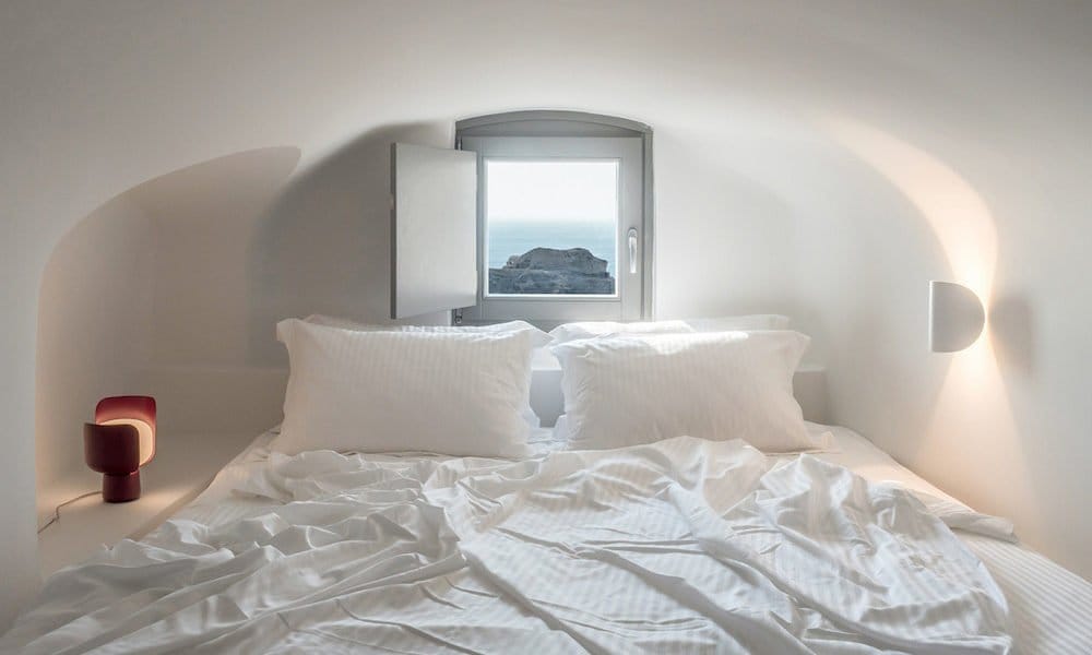 The architects recreated the suites and villas with modern day amenities, but took great care infusing it with Greece’s romantic past. They used local volcanic stone for the hotel’s key foundational pillars and walls, which, when combined with the castle’s coal wooden frames and brown plaster facades, balances out the light exteriors with a warm interior colur palette.