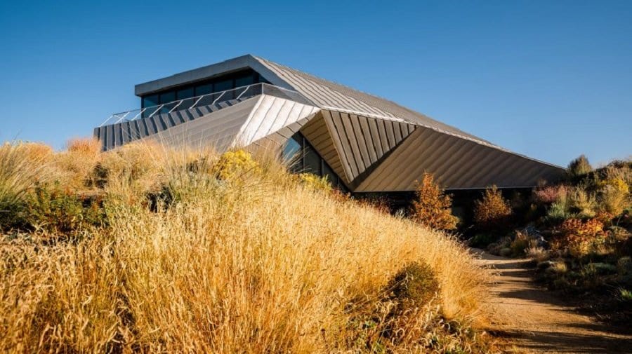 The slanted zinc-clad design of the property does not actually shapeshift. Instead, it seemingly blends in with its surroundings, almost making it look like an extension of the desert terrain.