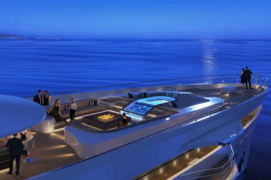 An almost vertical bow enables an extended waterline length and so allows the crash bulkhead to move forward. This way, it gains interior space and volume. Plus, you get more exterior space at the stern of the vessel. Finally, you’ll also find an impressive pool area, stunning waterfall features, and a large bathing platform.