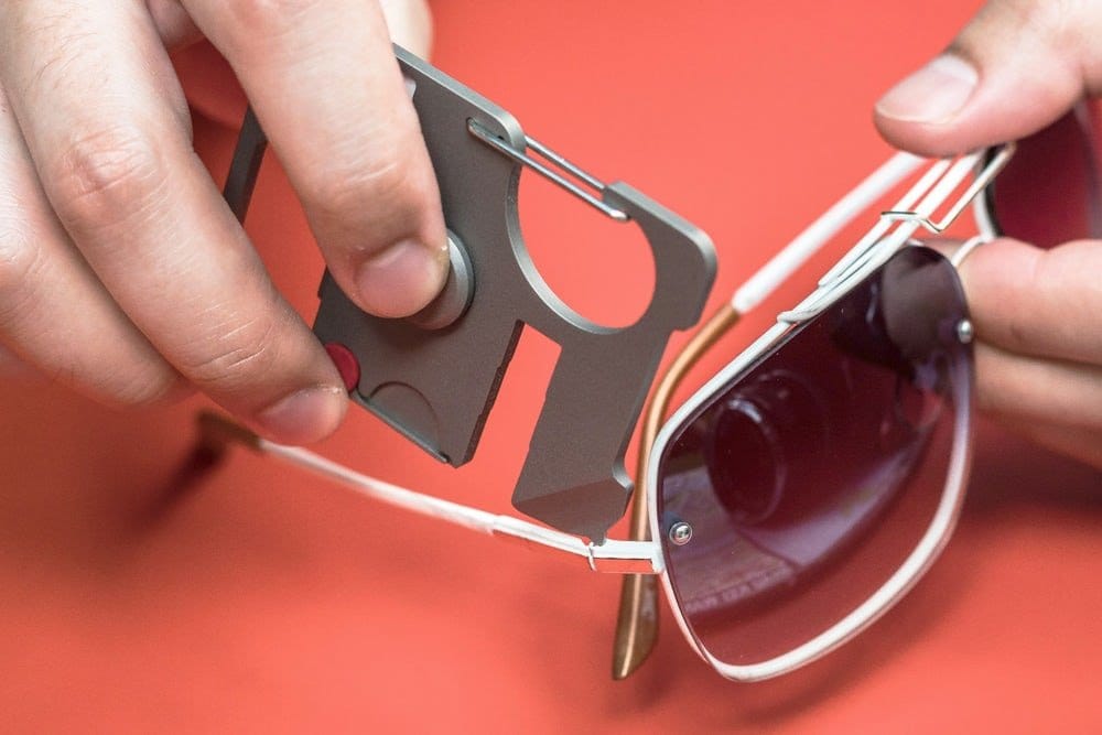 On the edge you’ll find a small protrusion (mini screwdriver), and near the edge of the frame you’ll find a gaping hole (bottle opener). There’s also a carabiner clip off to the side you can attach it as a keychain or latch it onto the pull tab of your bag’s zipper for easy access. Oh, and you might be wondering why it’s called the T’spin, emphasis on “spin.” Well, the whole thing is actually a fidget spinner as well.