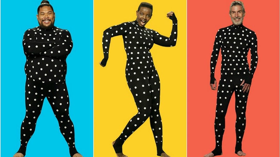 Visually, this wearable does not look at all appealing and reminds you of a scuba diving suit. It literally covers your body from neck to foot, with openings for the toes and fingers. White dots cover the entirety of the outfit.