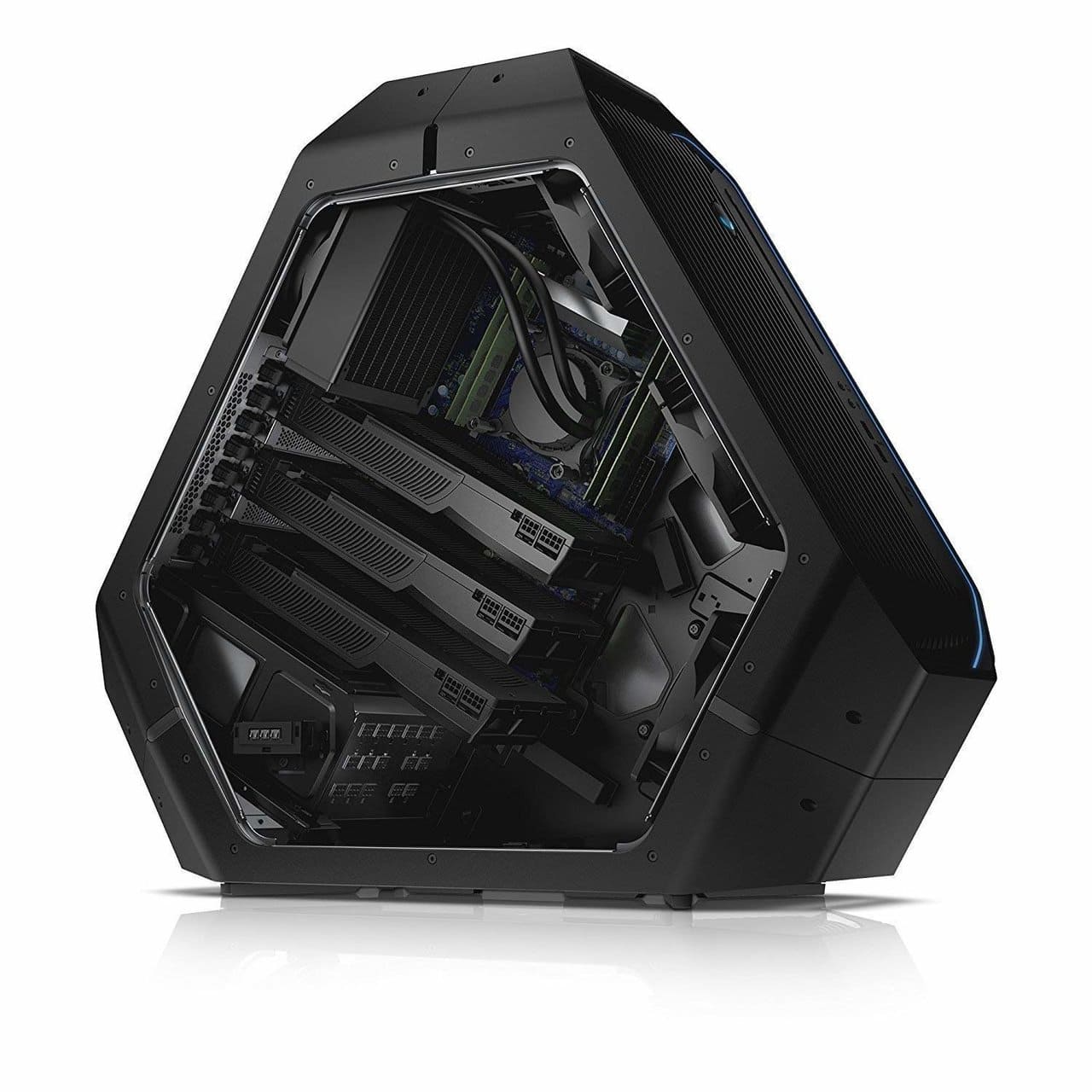 Alienware is planning to invade your homes with the 2018 Area 51 R2 gaming desktop computer. An angular monolith lined with sleek LEDs that provide a futuristic vibe to its enclosure. Don’t let the minimalist triangular form factor fool you—this imposing 22.4 x 25.16 x 10.74-inch object weighs in at a hefty 68.3 pounds. Thankfully, the integrated handles and unique shape make it easier to move around.