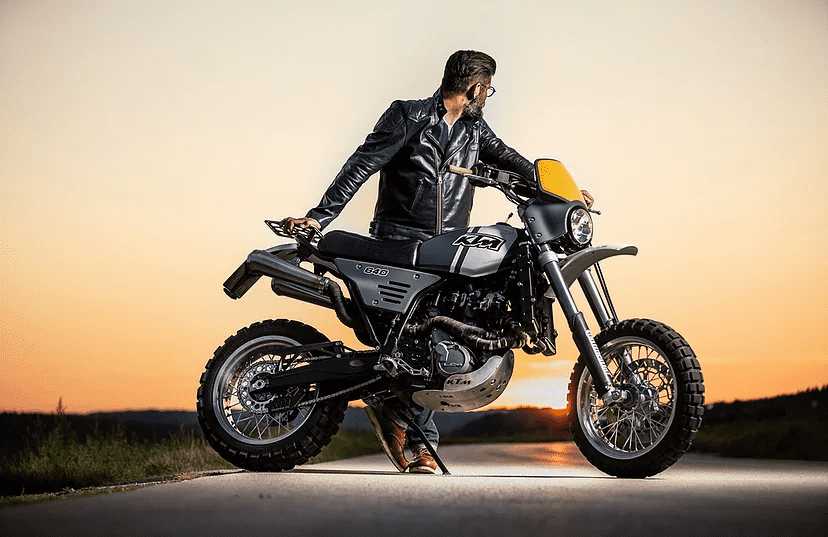 Then he lopped off the stock subframe’s square tubing and replaced it with a self-designed 1-inch tubular steel frame, integrating it into the original air box. After that, he used fiberglass pan and aged leather to build the KTM’s seat, and he also added an aluminum luggage rack.