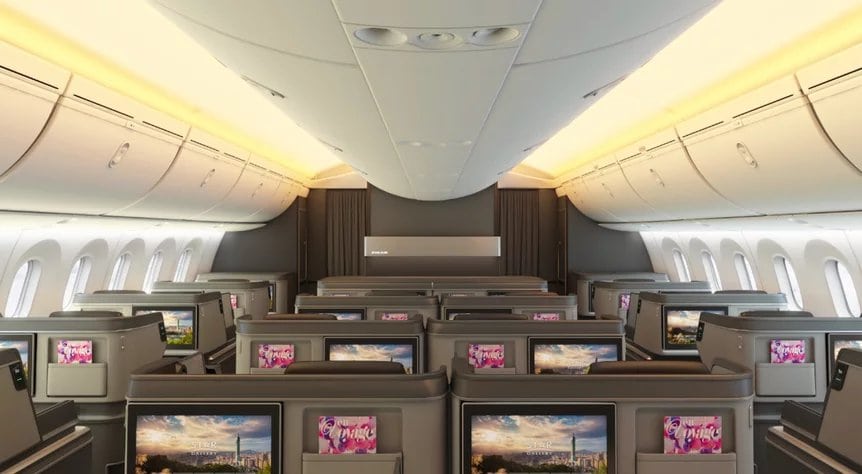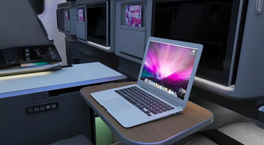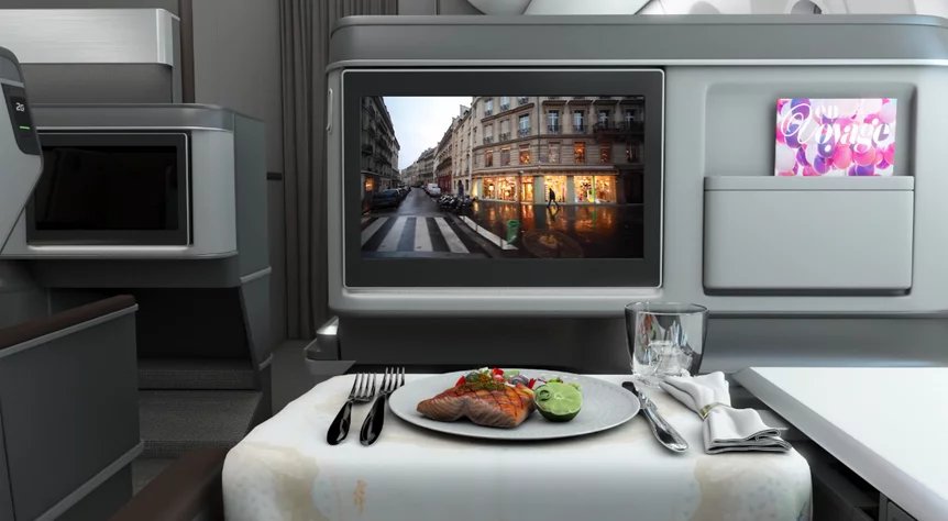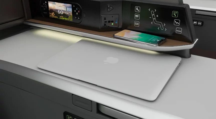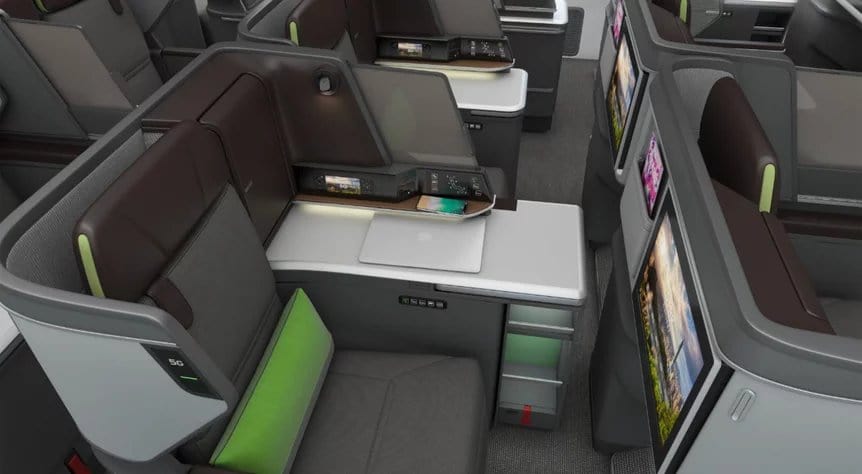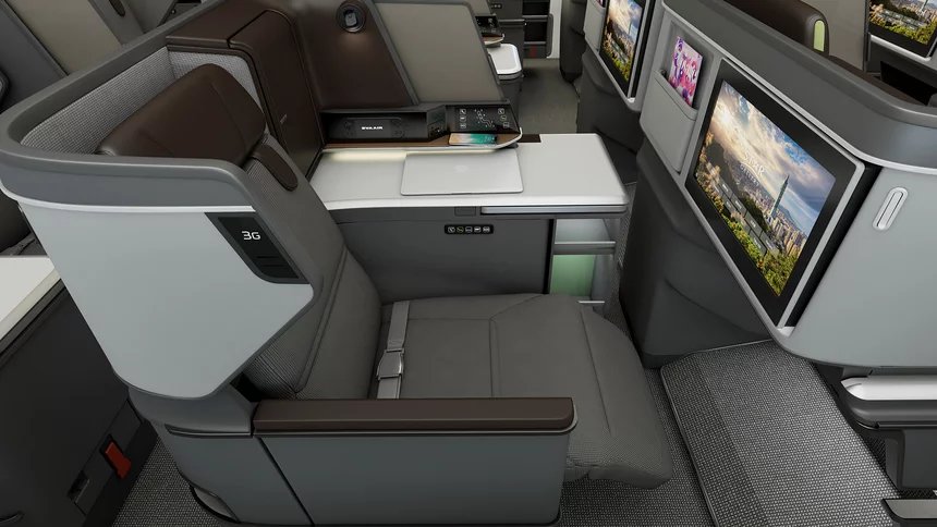 The seats, debuting on the EVA’s new Boeing 787-9 Dreamliner, are arranged in a one-two-one layout. They feature adjustable privacy panels between the paired middle seats, spacious built-in storage cabinets, a wide seat-side shelf, an extra-large work table, and a massive 18-inch HD touchscreen display.
