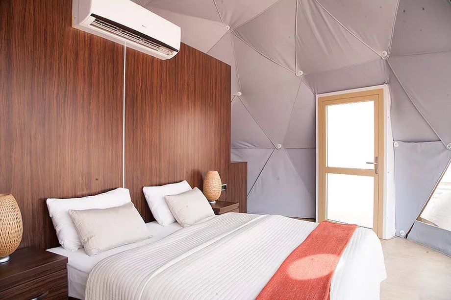Those geodesic “Martian Domes” were apparently modelled after the Buckminster Fuller’s famous design. Inside each you’ll find a terrace, a private bathroom, and a king-sized or double bed. You’ll also be facing a tall stack of windows overlooking the red terrain outside.