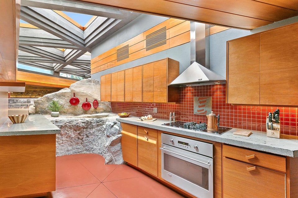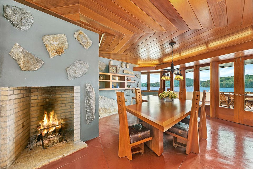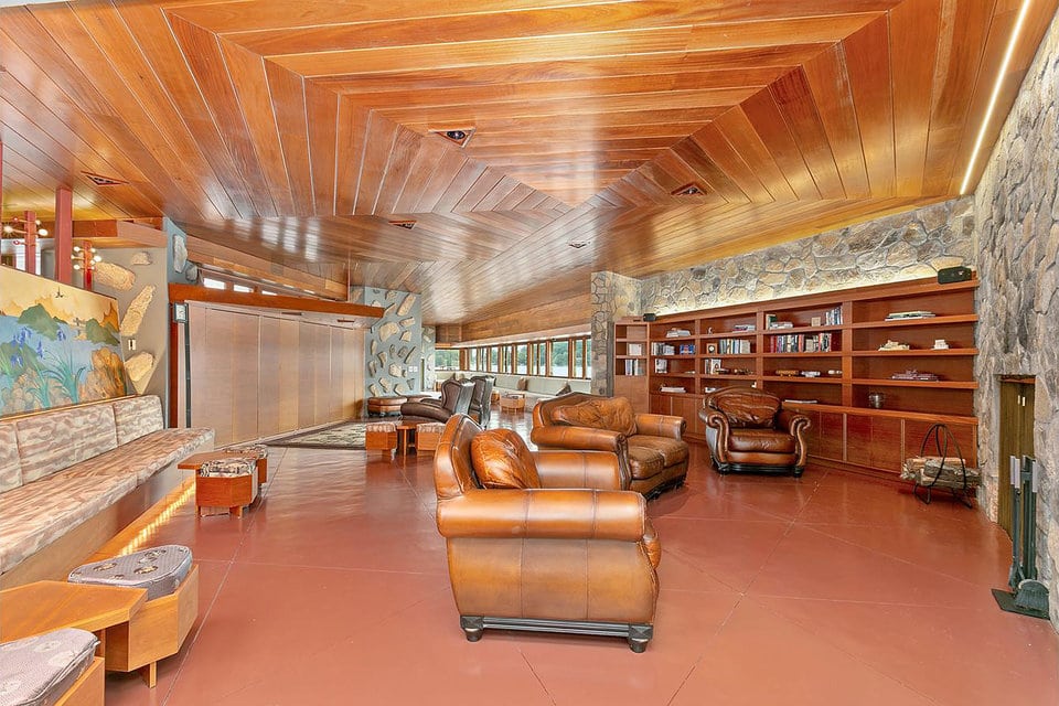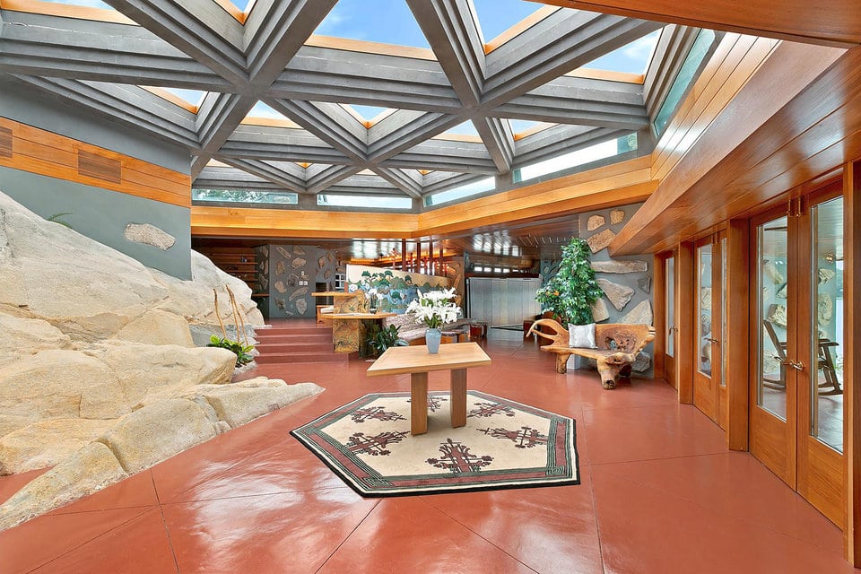 The main abode was finished well after Wright had died, of course. But it retains all of Wright’s architectural peculiarities and genius. That explains the organic integration of the site’s natural rock, built-in furniture, and multiple cantilevered decks.