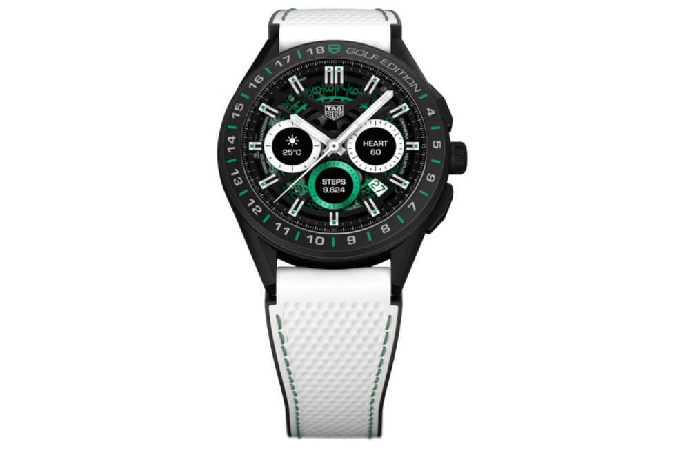 Those who purchase of Connected Golf Edition are also getting two straps: A black rubber, and a two-tone white/black rubber with green stitching. The rest of the collection either ship with rubber or stainless-steel bands which all have a folding clasp with push-button releases.