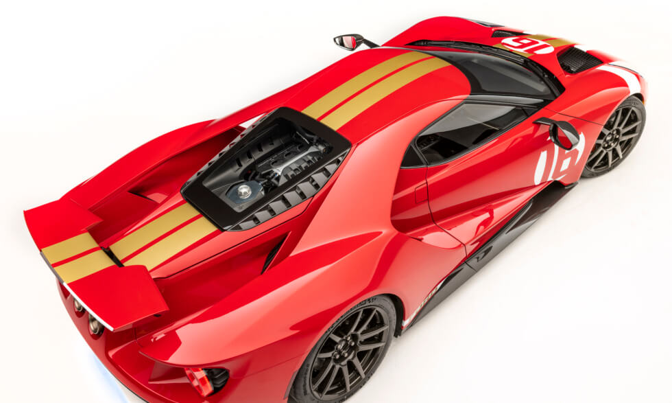 Open the rear cover to reveal a 3.5-liter twin-turbo V6 engine. Just like the regular variants, it produces 660 horsepower with 550 lb-ft of torque. The Ford GT Alan Mann Heritage Edition might be the last special edition trim as the line approaches the end of production.