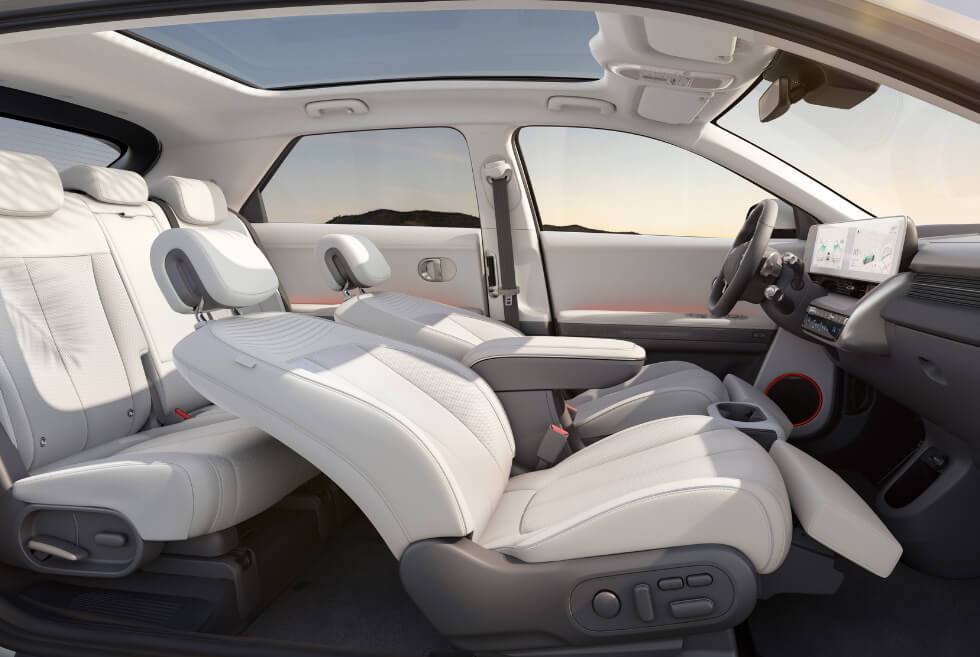 Step inside the spacious cabin of the IONIQ 5 to see the combination digital instrument cluster and infotainment setup. Both displays measure 12 inches diagonally and occupy a huge space of the dashboard. Hyundai points out that the driver can slide back the center console to easily shift to the passenger side.
