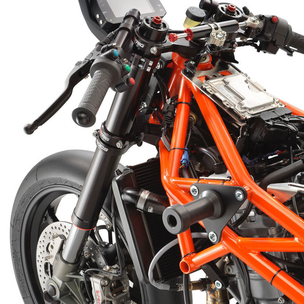 Starting with the trellis frame, KTM is building it out of chromium-molybdenum steel. Krämer Motorcycles is likewise on board to craft this platform for those willing to harness its capabilities. The 2022 RC 8C weighs approximately 309 lbs thanks to GRP with carbon Kevlar bodywork.