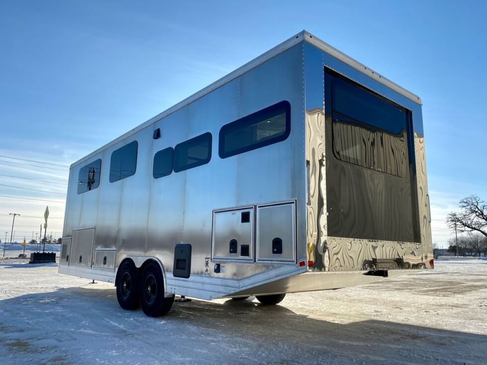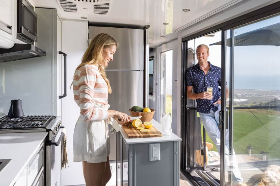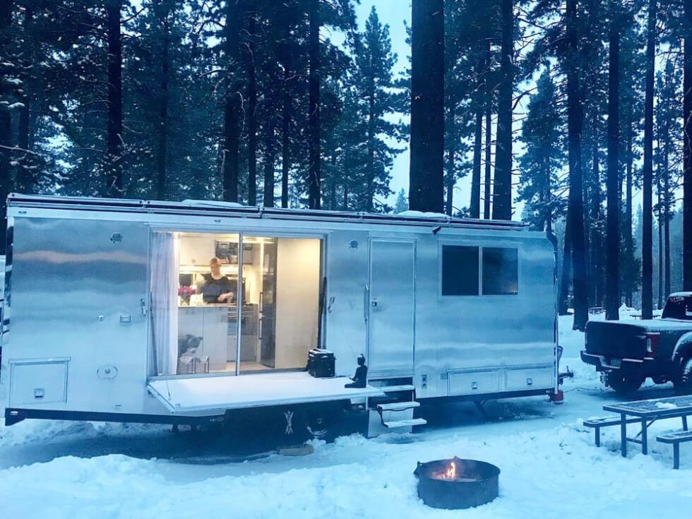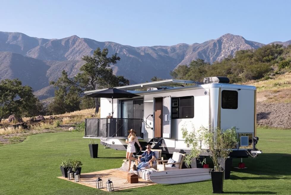The 2022 Living Vehicle Pro-EV is fully customizable. The sleeping area can easily allow an 80-inch desk with the queen-size memory foam bed folded. It even has a foldable railing that can be raised or lowered with a push of a button.  This camper also addresses the need to be one with nature with an eight-foot sliding glass door that opens to the surrounding view. You can set up a fire pit outside for a backyard BBQ feel.