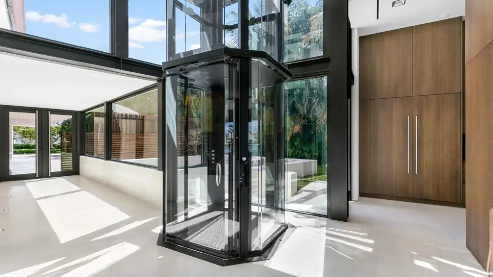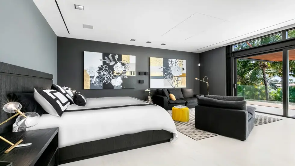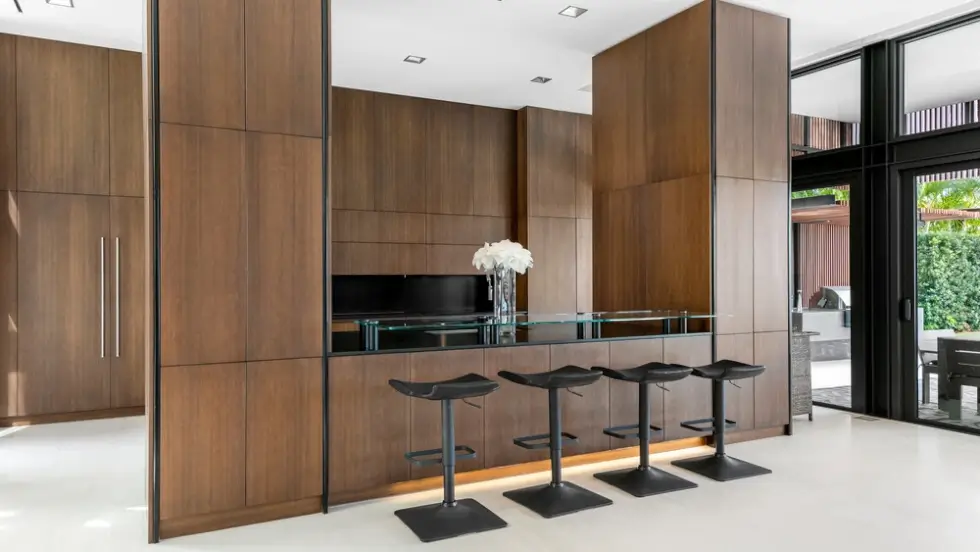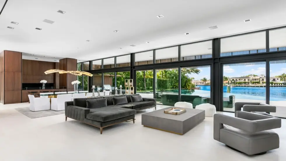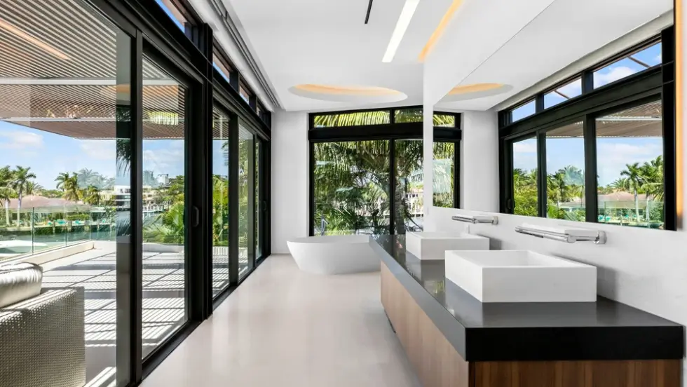 A warm custom glass elevator and sunken fire pit greet you as soon as you enter. From there you will see the living area and kitchen share an open floor plan with glazing that provides ample scenic views. These spaces are equipped with Gaggenau appliances and boast high ceilings. Then on the second floor are the primary suits which overlook the water and private terrace extending the width of the manse. The rooms also have their own sitting area, a boutique-style closet, and a spa-like bathroom.