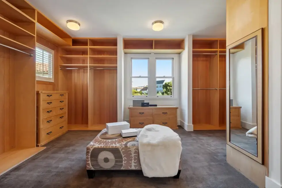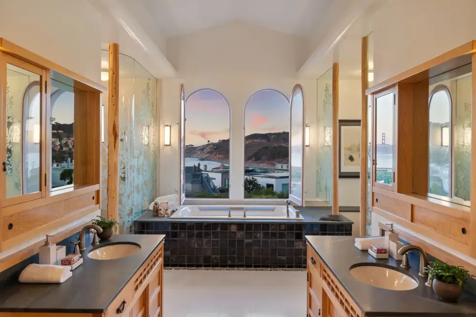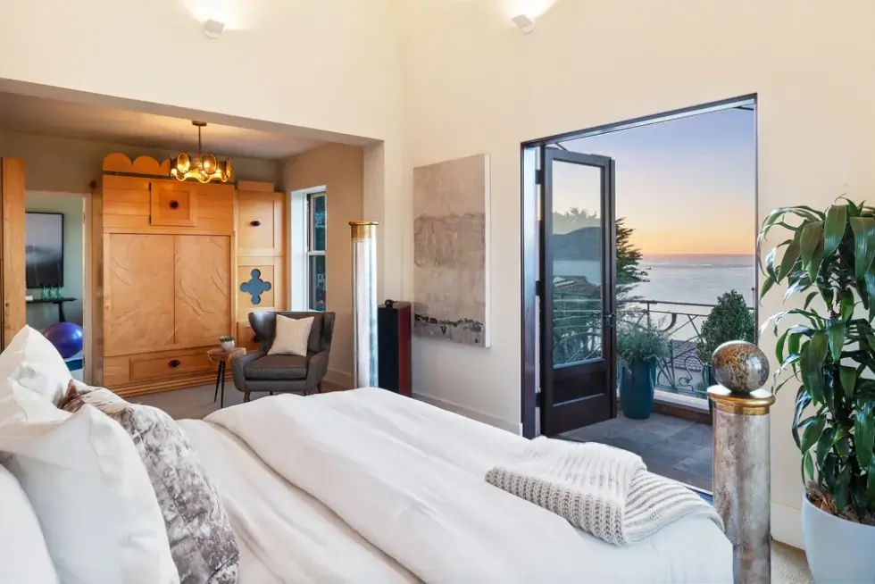 The main bedroom boasts a contemporary feel and has a Japanese-inspired bathroom with built-in vanities. It also has a walk-in shower and a platform tub. A one-bed guest apartment sits on garden level and has its own entrance. Williams’ 540 El Camino Del Mar estate also has a gym, a Finnish sauna, a wine cellar, and four-car garage.