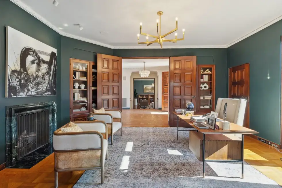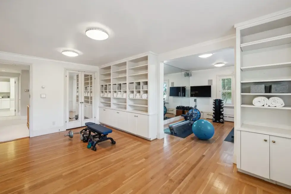 Meanwhile, modern upgrades include a movie theater with a drop-down projector, a secret passageway connecting to the children’s bedrooms, and a Prohibition-era bar concealed behind wood wall paneling. Elsewhere, there’s a chef’s kitchen equipped with a La Cornue Range and custom cabinets by U.K.-based Smallbone Design Studio.