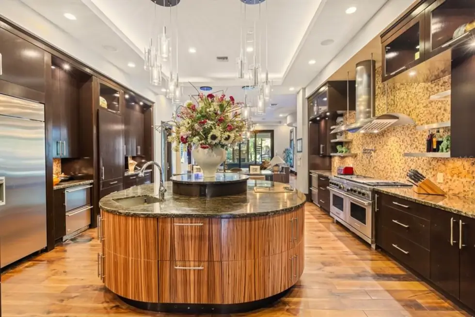 The primary suite in Jonny Damon’s Florida estate is ensconced in a dedicated wing on the first floor and has a coffee bar, a two-story closet, and both indoor and outdoor showers. Elsewhere, the chef’s kitchen comes equipped with large islands, a walk-in pantry, and a breakfast bar while a separate kitchen is reserved for catering. Alice Anne Jackson of Corcoran has the listing.