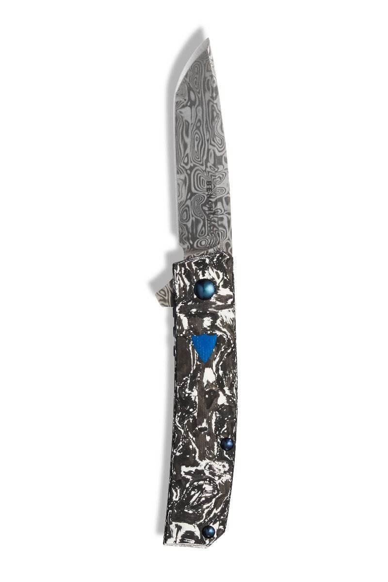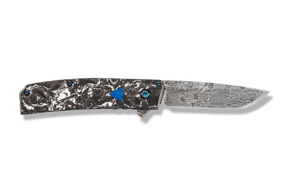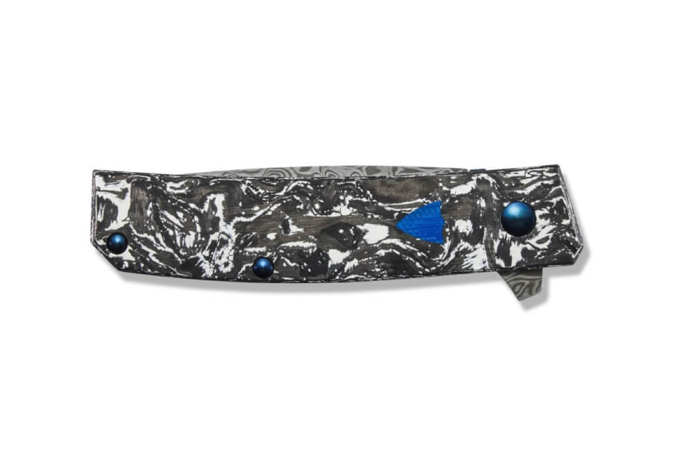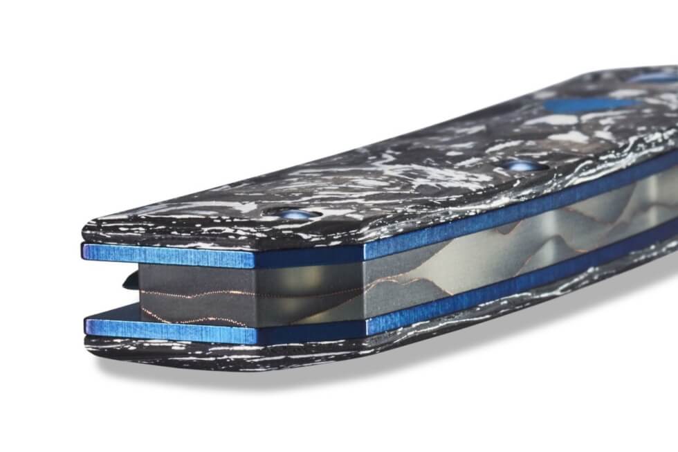 Moreover, the 601-211 Tengu Flipper now comes with marbled white and black carbon fiber scales designed with Sapphire blue PVD hardware and liners. The handle also has a Raffir blue uranium waves backspacer and one of Oeser’s iconic shield inlays done in blue G10.