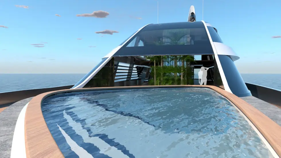 Currently, the renders of the ship offer a general overview of how the decks would appear when symmetry is optional. To provide uninterrupted views of its surroundings, the wheelhouse is located at the topmost level of the 61 Asymmetric. Depending on the client, the team can turn the double-level area into a greenhouse, lounge, or whatever they want.