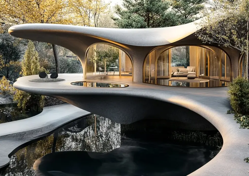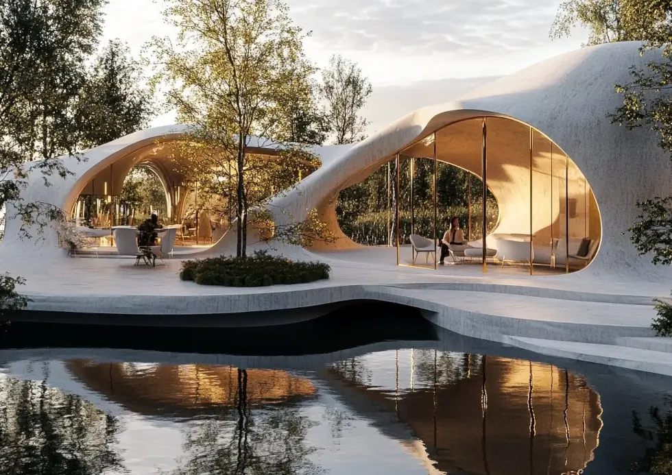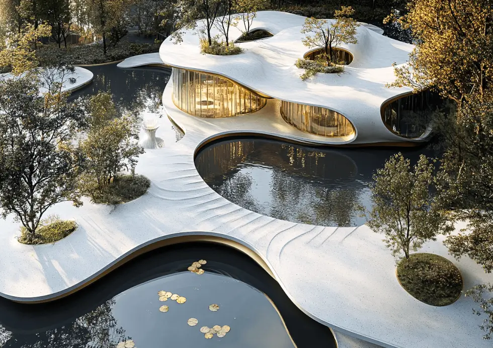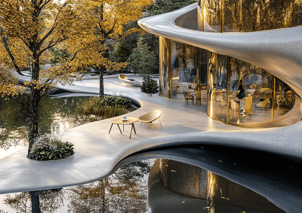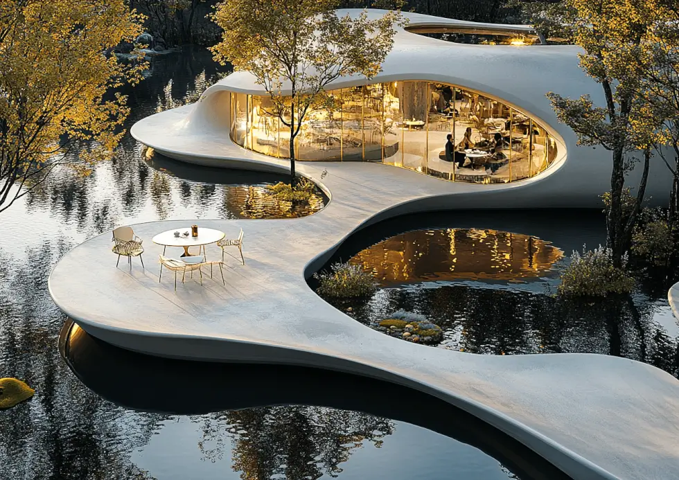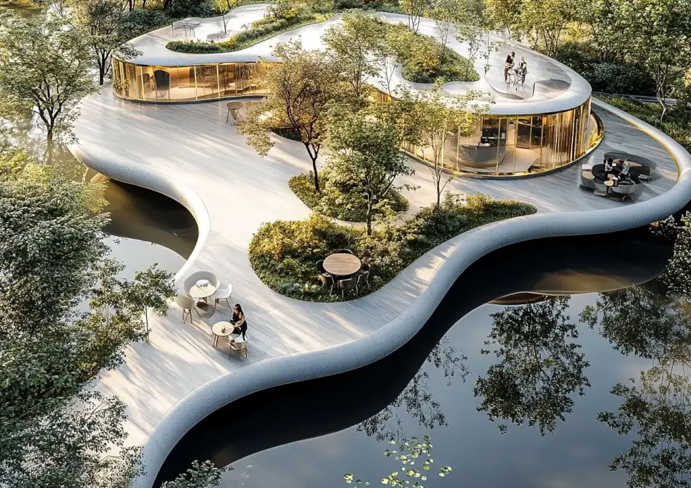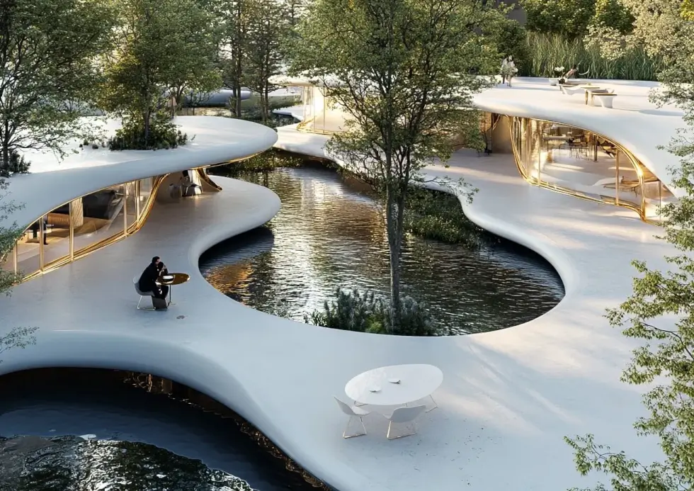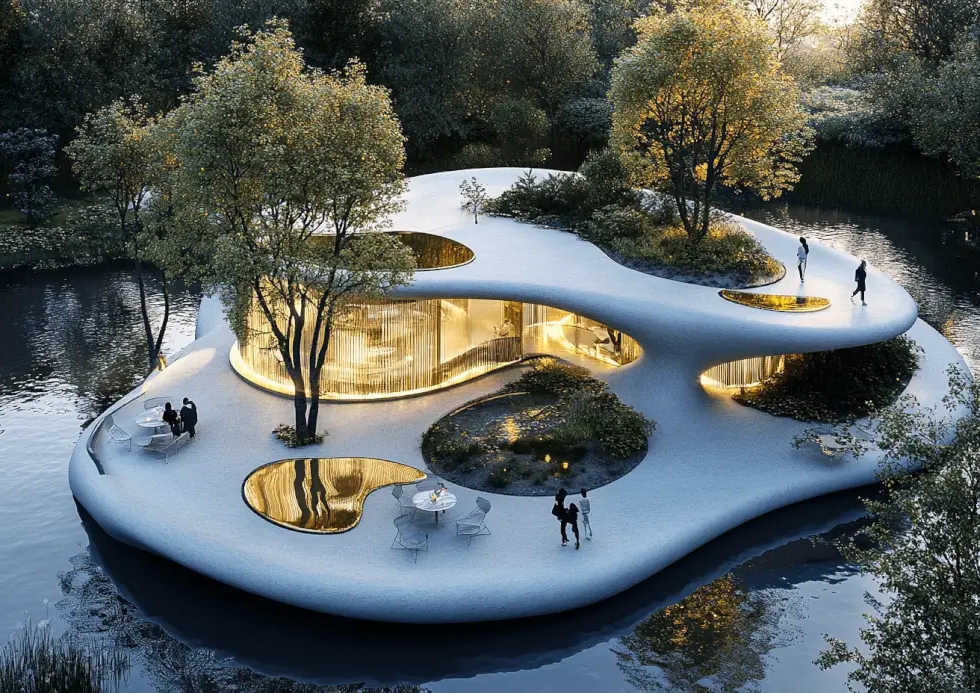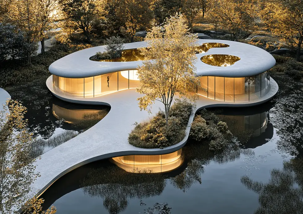 Architect and engineer Azadeh Hamidi designed the conceptual Aban Café-Gallery in harmony with nature. It sits peacefully in the middle of a quiet lake with its soft facade and pathways echoing the water’s gentle ripples. The structure prioritizes connection with the surrounding trees and lake. It opts for soft flowing lines and minimalist aesthetic that evoke the feeling of serenity.