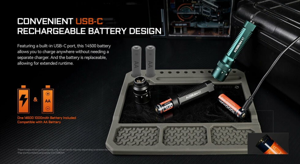 This EDC flashlight includes a removable 1,000 mAh 14500 lithium-ion battery. You can charge the latter via a built-in USB-C port. Another highlight of the K1 is its wide voltage support, which makes it compatible with both regular dry cell AA batteries and NiMH batteries.