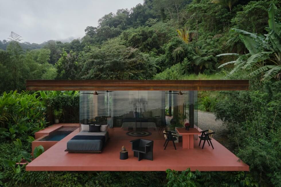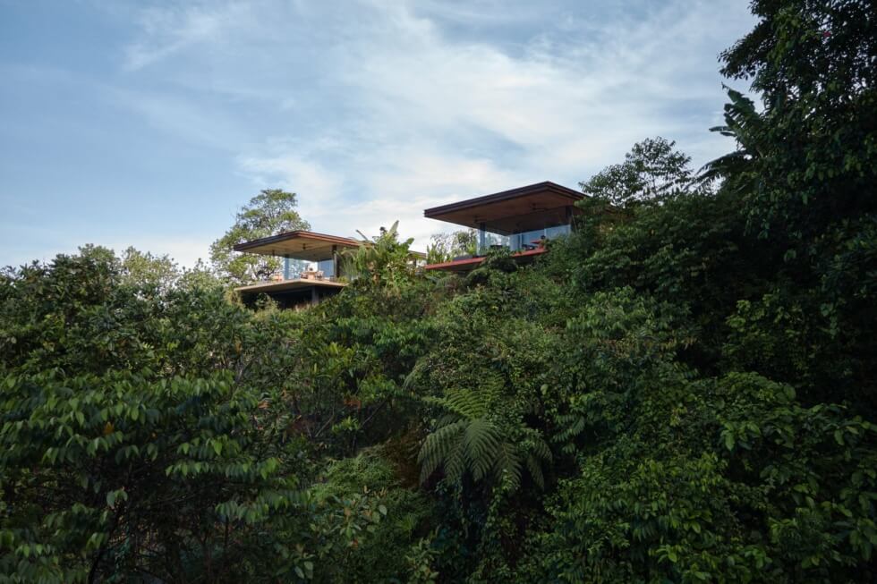 The Achiote Jungle Villas feature floor-to-ceiling frameless sliding glass doors that provide a partition between the terrace and the bedroom. The villas partly levitate above the steep slope at a height of around 300 m above the sea. Nestled in the middle of the jungle, they provide the perfect opportunity to enjoy Costa Rica’s natural beauty. The area is bursting with wildlife, monkeys, tropical birds, sloths, and other local animals. Guests at the villas can also learn more about the local flora and wildlife and venture the rainforest on foot or by bike. They can also enjoy rafting, hiking, or zip-lining near the area.