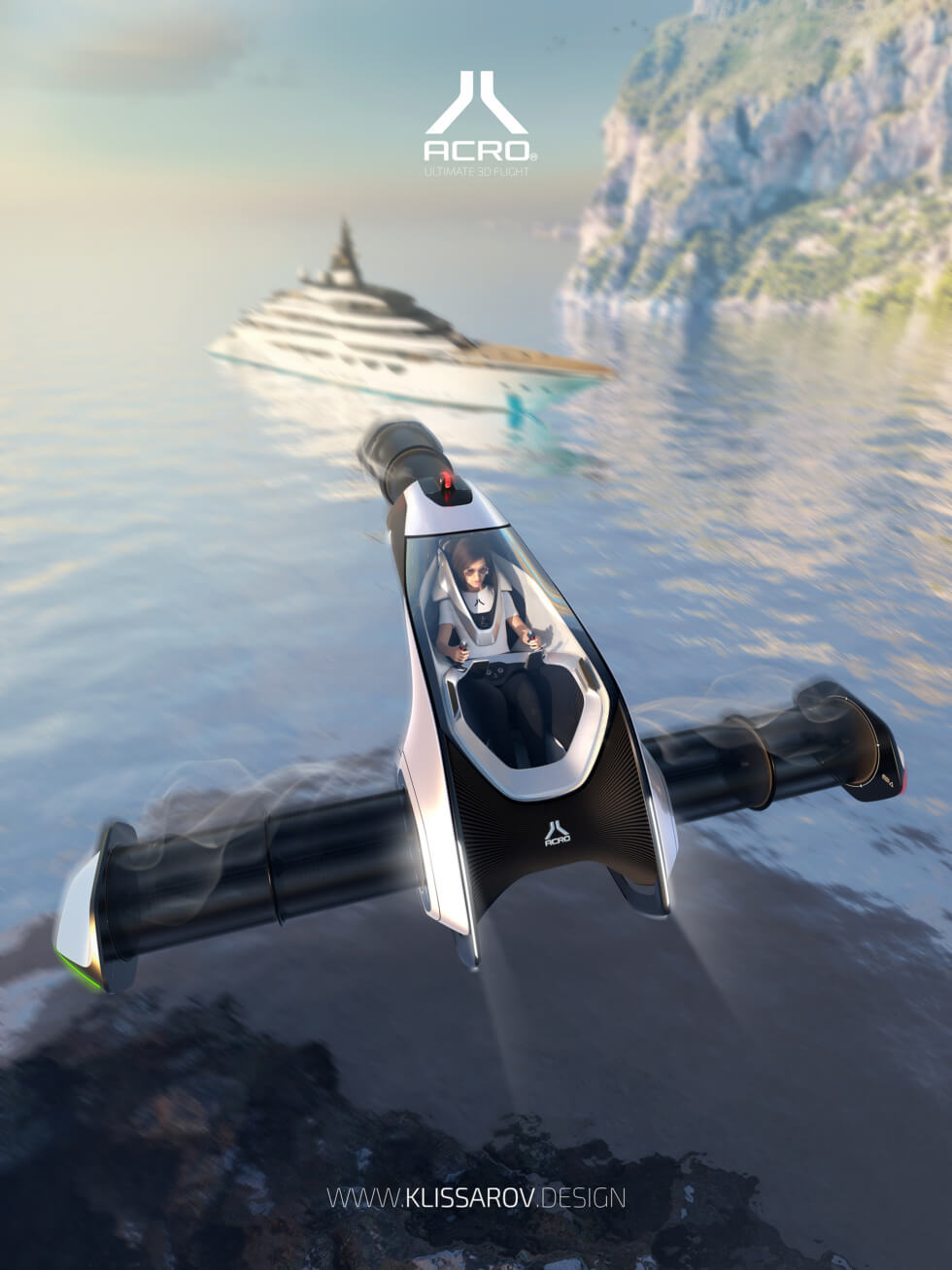 As personal mobility platforms such as electric bikes, scooters, skateboards, and others in between become ubiquitous, commuters will eventually run into problems with traffic congestion. Therefore, the proposed solution would be to take to the skies. One firm envisions a unique take on electric vertical take-off and landing (eVTOL) vehicles. The Acro is designed for owners of luxury vessels who desire more thrills.
