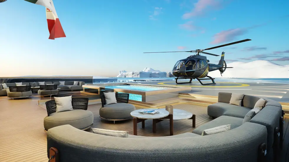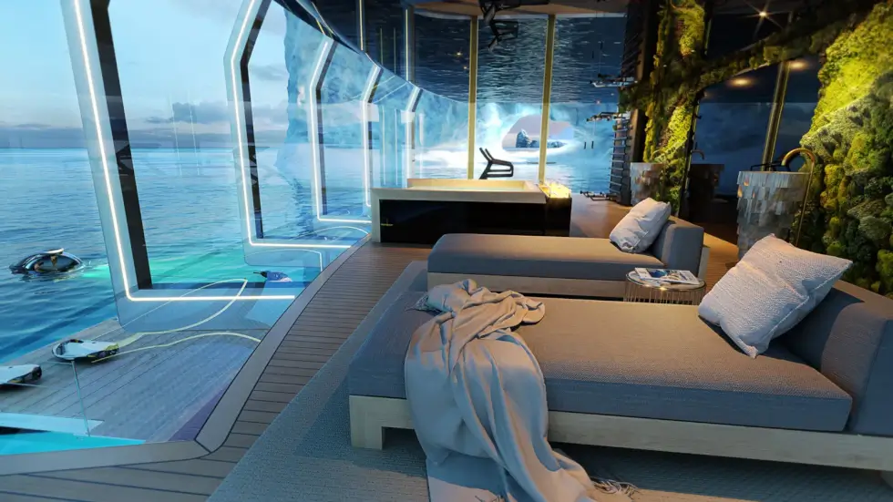 Aside from the striking vistas you get aboard this vessel, there’s plenty to keep everybody engaged throughout the trip. There are two pools, a foredeck lounge, a wellness area, a beach club, and a recreational area to store and deploy water toys. There’s also enough space to hold a 33-foot inflatable tender, a 33-foot limousine, an 18-foot RIB.