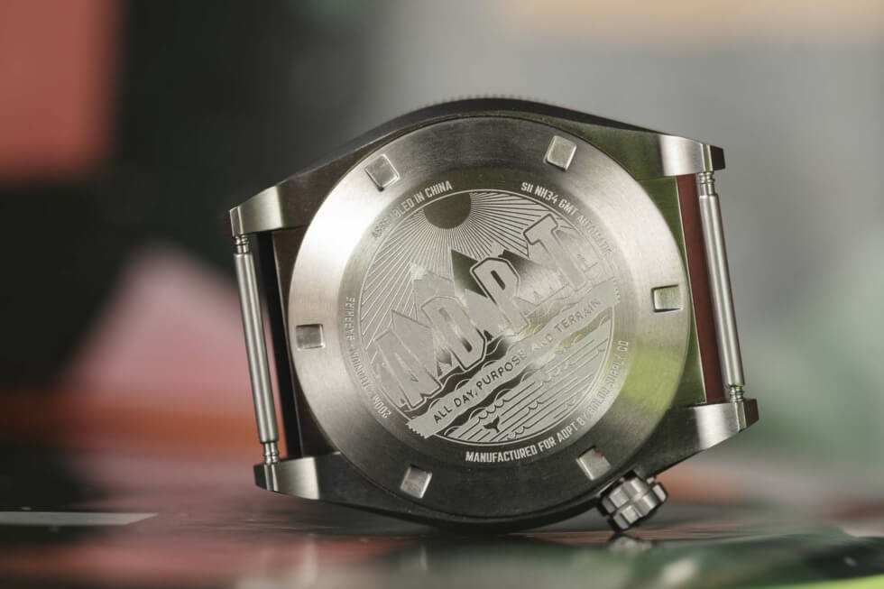 Unfortunately, to retain its robust 200-meter water resistance, the manufacturer went with a solid screw-down titanium case back. The playful branding is engraved prominently here, which is a nice touch. Your ADPT Series 1 Dual-Time ships with a US-made single-pass nylon strap for breathability and overall comfort.