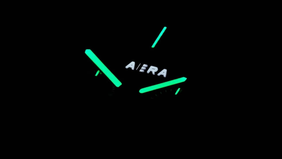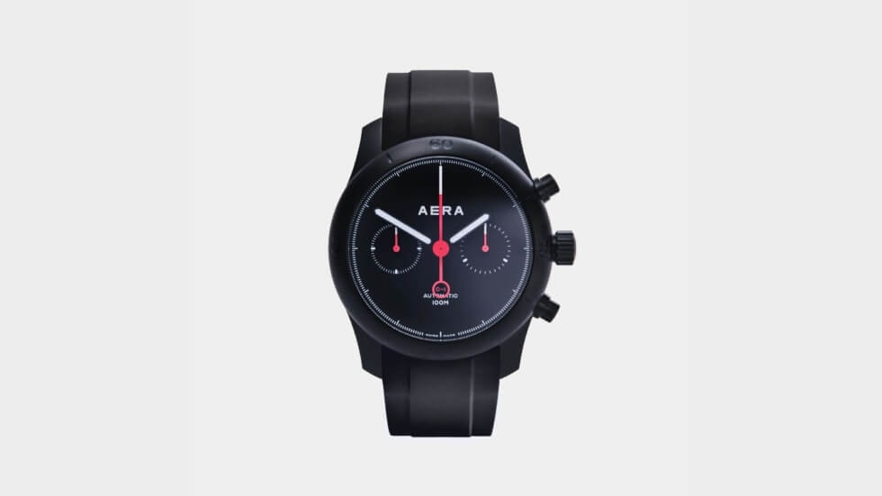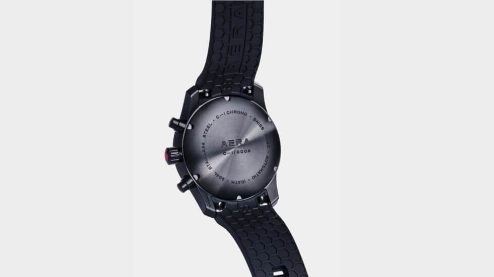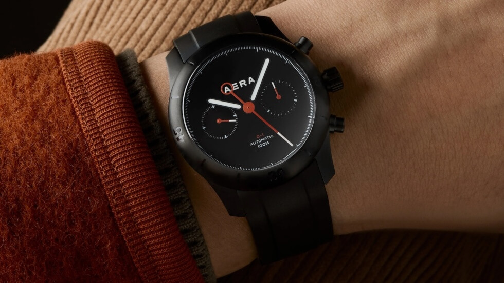 “Powered by an automatic Sellita Bi-compax movement, the C-1 Shadow features Aera’s signature dished dial, domed sapphire crystal, and vivid red-lacquered chronograph details for precision, clarity, and understated sophistication,” describes the product page.