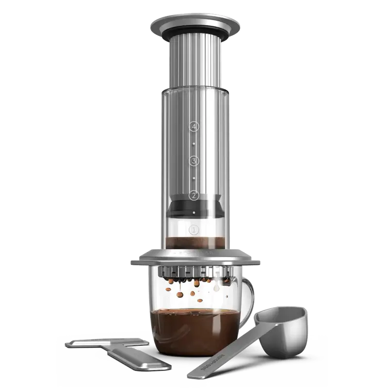 The immersion process wets and aerates the coffee grounds for smoothness. During this process the grinds get their deep flavor with a full bodied finish often found in a French Press. Finally, air pressure efficiently pushes the brew through the coffee bed and filter to remove the grit and bitterness. The AeroPress Coffee Maker Premium delivers smooth, grit-free, and full-bodied coffee that tastes great until the last sip.