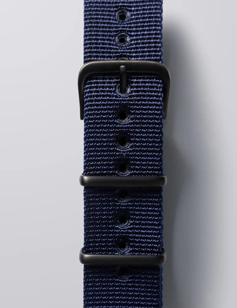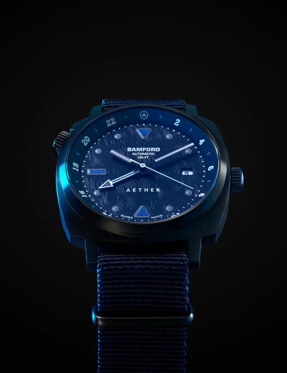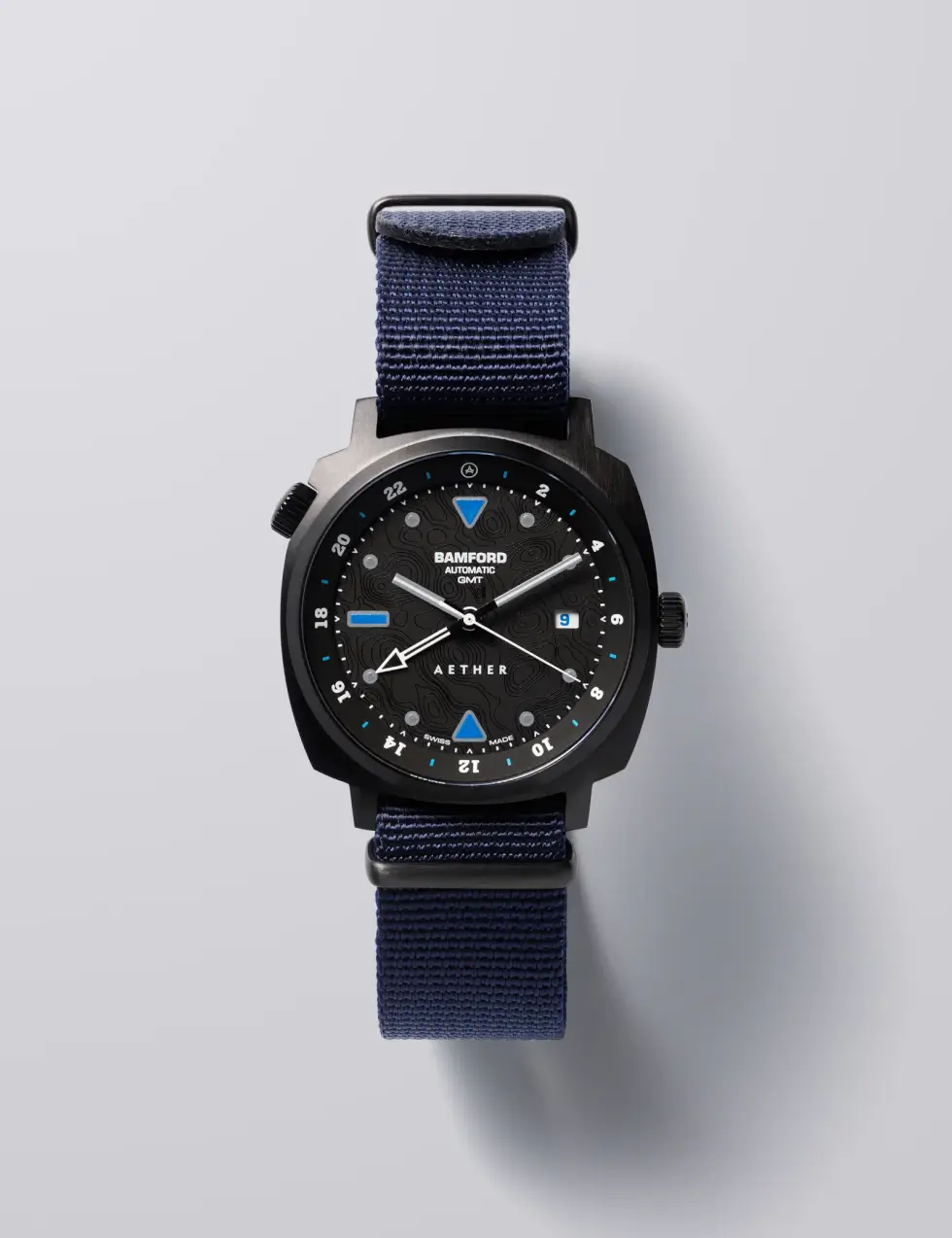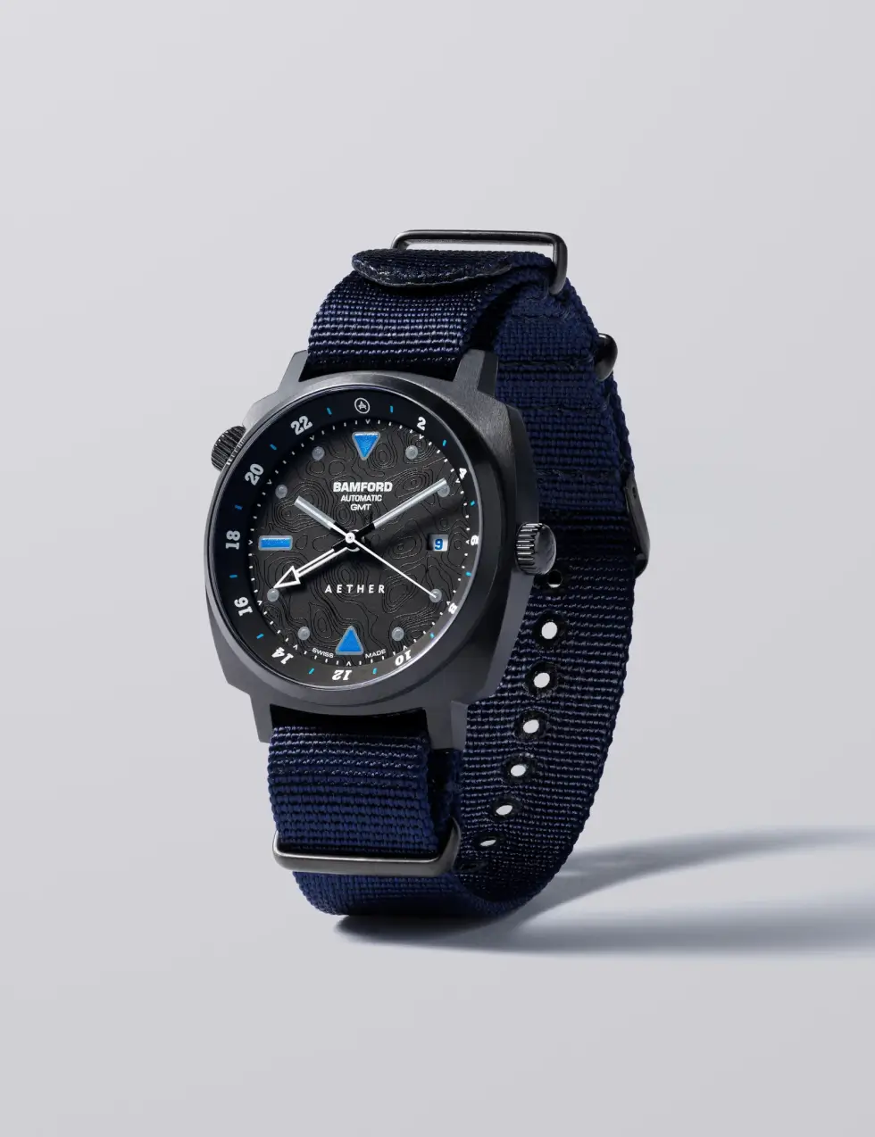 A date window is located at 3 o’clock, while the GMT hand is represented by the arrowhead. “The versatile AETHER + Bamford GMT effortlessly complements both formal and casual environments, indoors and outdoors,” reads the product page. The watch comes with a dark blue NATO strap.