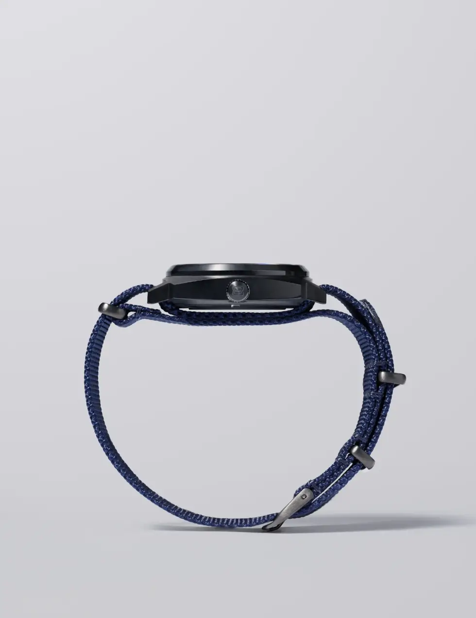 The AETHER + Bamford GMT flaunts a bold blackout theme with a matte finish for that mysterious allure. Elements such as the hour markers and indices in AETHER Blue provide a chromatic break from all that darkness. Its 40 mm x 11.7 mm case is crafted out of 316L stainless steel with an anti-glare sapphire crystal.