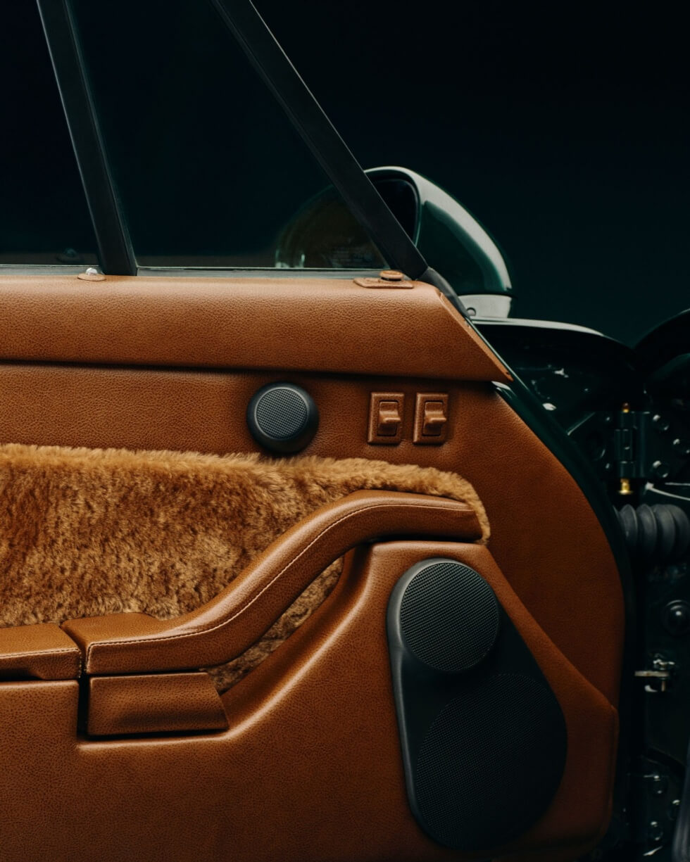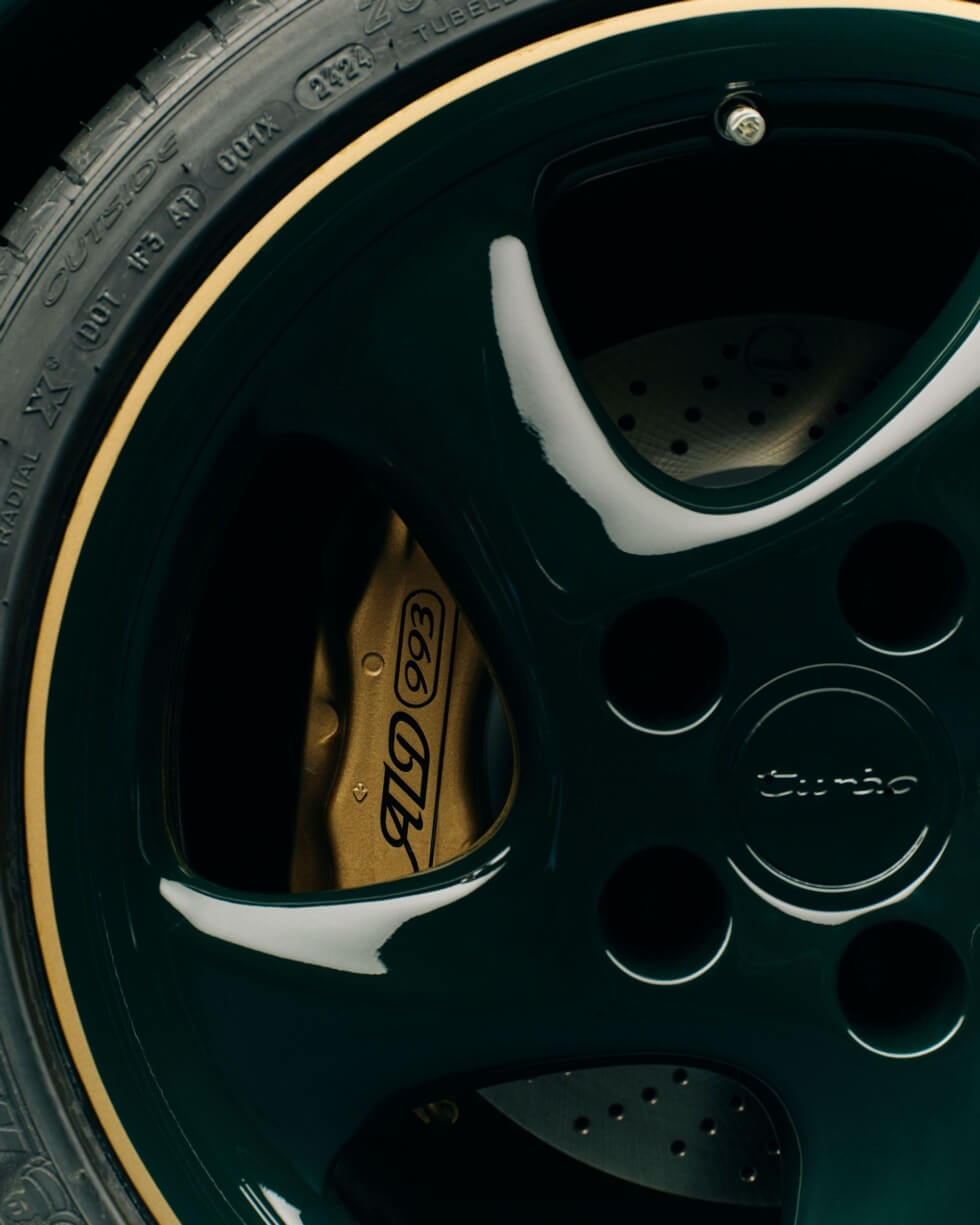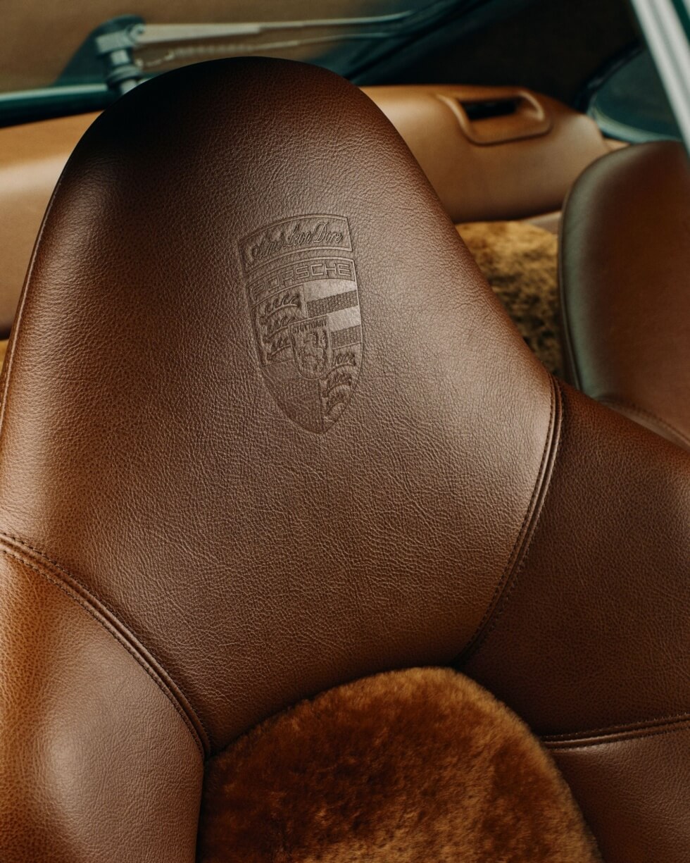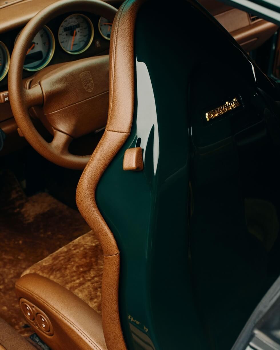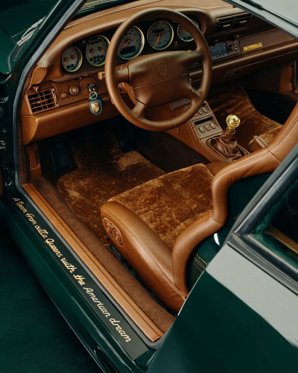 Once again, Mulberry Green wraps the hardback seat, while special Porsche and Aimé Leon Dore emblems appear on the steering wheel and headrests, As a cool tribute to where ALD was founded, the Porsche 993 Turbo showcases a unique golden Unisphere shift knob and a dedication on the door sill. The script reads, “A team from outta Queens with the American dream.”