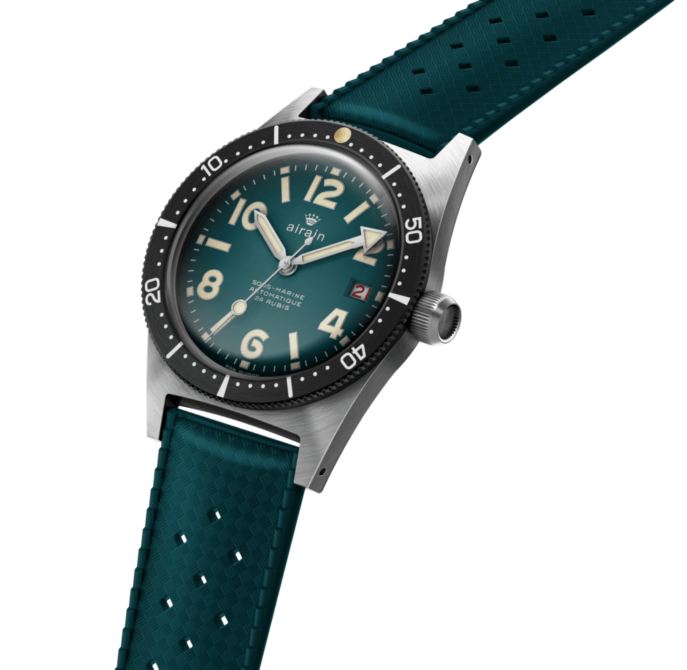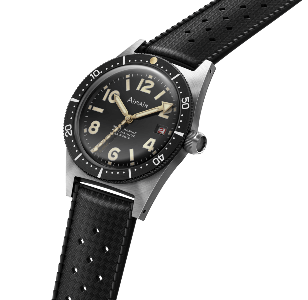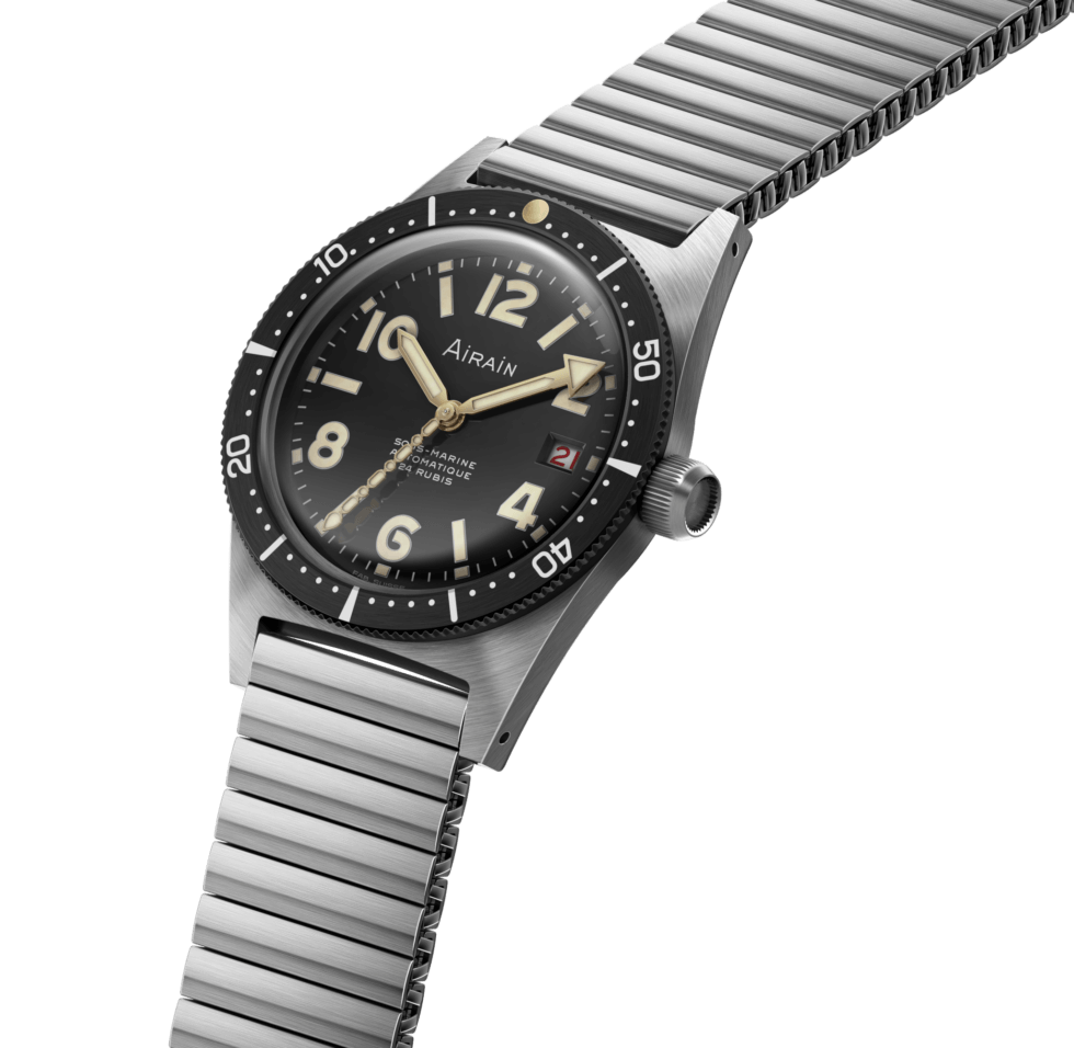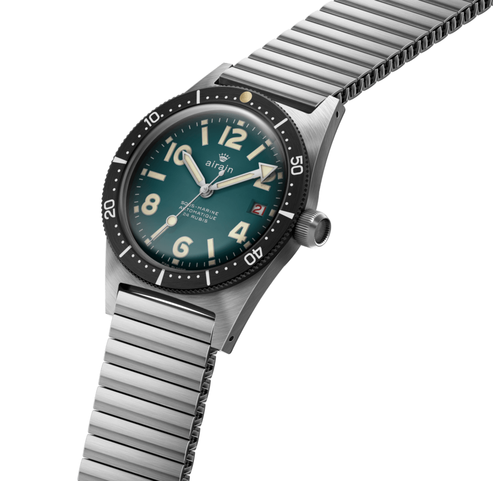 Its dial shows a mix of Arabic numerals and baton hour markers with a date window at 3 o’clock. Super-LumiNova coating on the hands, indices, and dot at 12 o’clock of the bezel insert ensure optimal visibility in the dark. The CoLAB Sous-Marine Re-Edition runs on a 24-jewel AM5 automatic caliber with a 68-hour power reserve. Finally, it ships with a Fixoflex stainless steel bracelet.