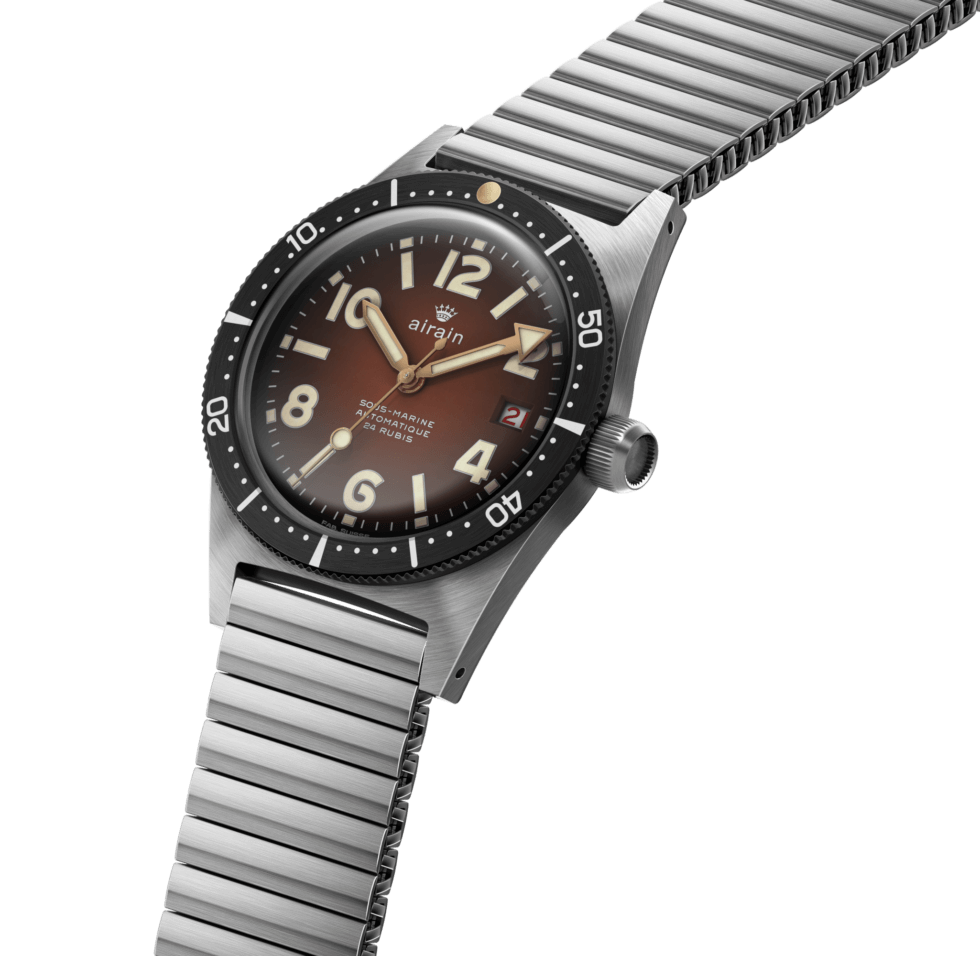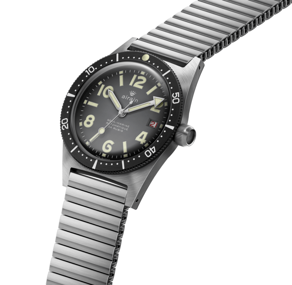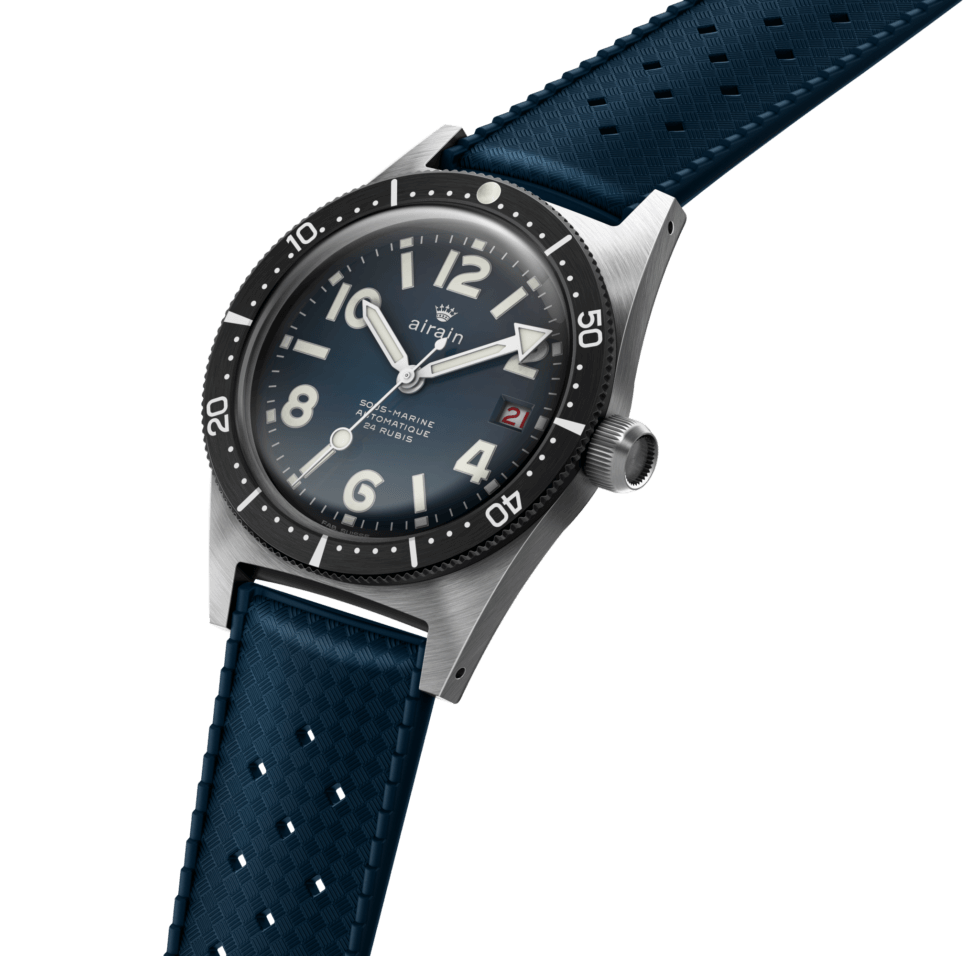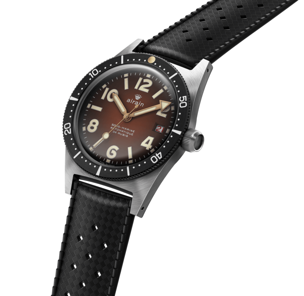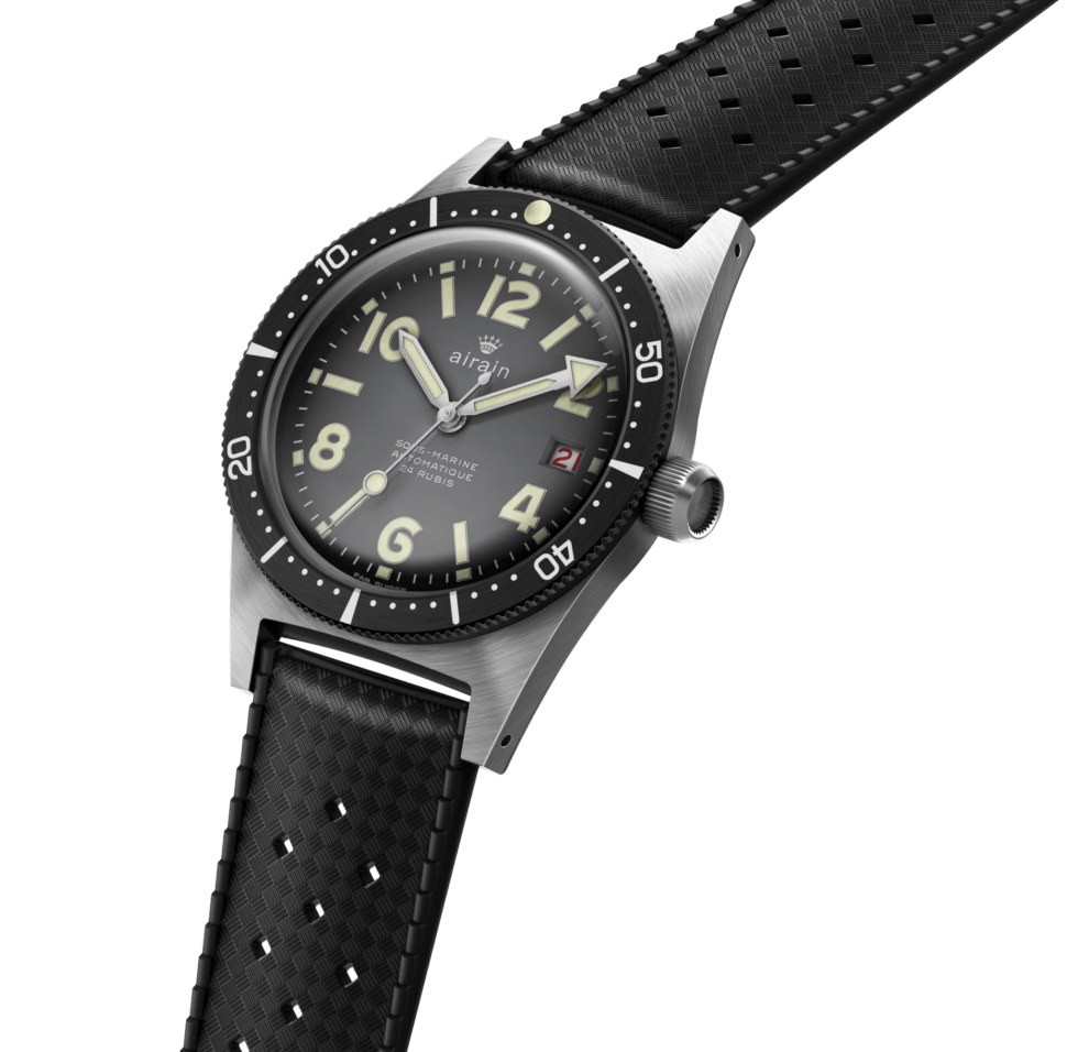 Its dial shows a mix of Arabic numerals and baton hour markers with a date window at 3 o’clock. Super-LumiNova coating on the hands, indices, and dot at 12 o’clock of the bezel insert ensure optimal visibility in the dark. The CoLAB Sous-Marine Re-Edition runs on a 24-jewel AM5 automatic caliber with a 68-hour power reserve. Finally, it ships with a Fixoflex stainless steel bracelet.