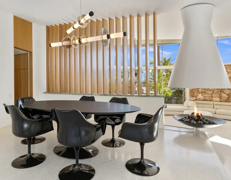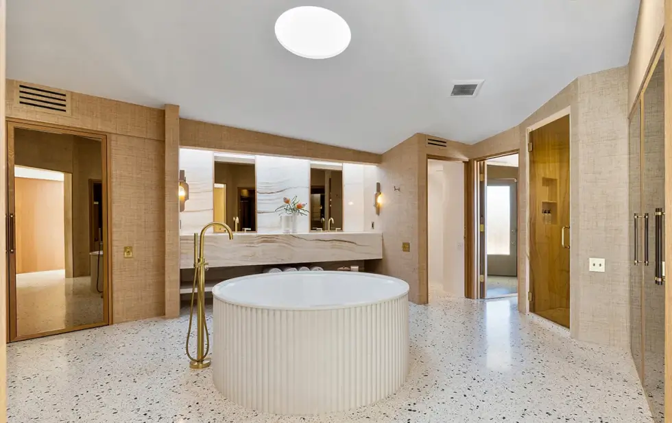 Meanwhile, the elevated dining area connects to the kitchen boasting quartzite countertops, white oak cabinetry, and a round island with five stovetop burners. Then up the stairs are the private spaces (four bedrooms) with the spacious primary suite boasting a circular soaking tub and private balcony access.